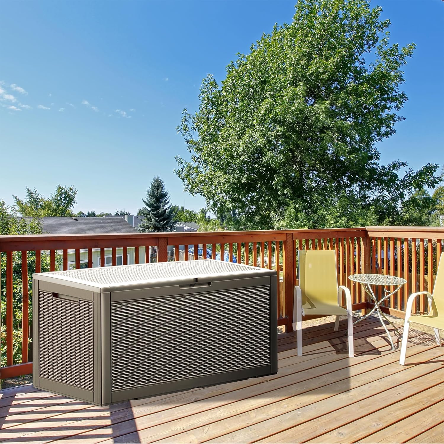- High-Quality Resin Material:Constructed from the latest high-quality resin, this deck box is waterproof, UV-resistant, anti-fading, and anti-bending, ensuring durability for long-term outdoor use.