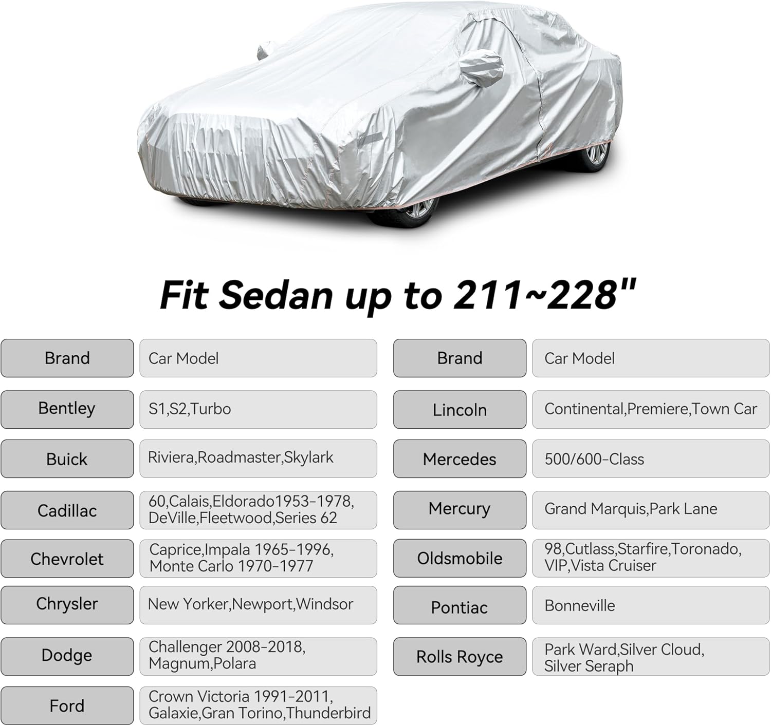 - 【Choose the Right Model】This large car covers for automobiles is universal fit for sedan which length is up to 228 inch.See the product images for applicable vehicle models.The universal car cover comes with a storage bag,you can store it easily when not used.