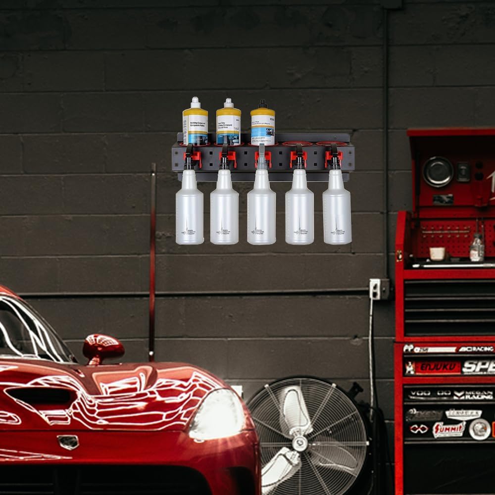 - Large capacity design: This spray can holder measures 21 * 4.3 inches and has ample storage space to accommodate 5 spray cans. The spray bottle holder is also equipped with 5 spray can hooks to meet the diverse needs of car beauty salons or households. Whether it's various types of spray cans, wax jars, abrasives, or other items, they can be neatly placed on the rack, making storage more organized.