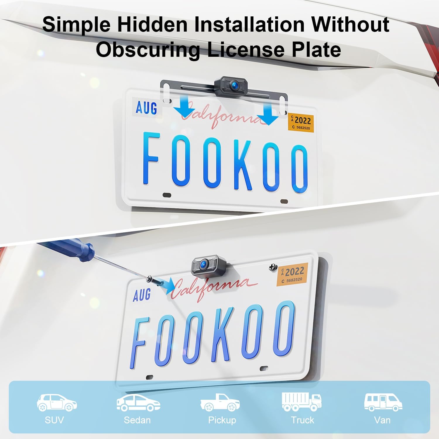Fookoo HD 1080P 5-inch Wireless Backup Camera, 5" Split Screen Monitor Rear View Licence Plate Camera, DIY Guide Lines Wide Angle IP69 Waterproof Easy to Install for Car Pickup Van SUV - DW5CT