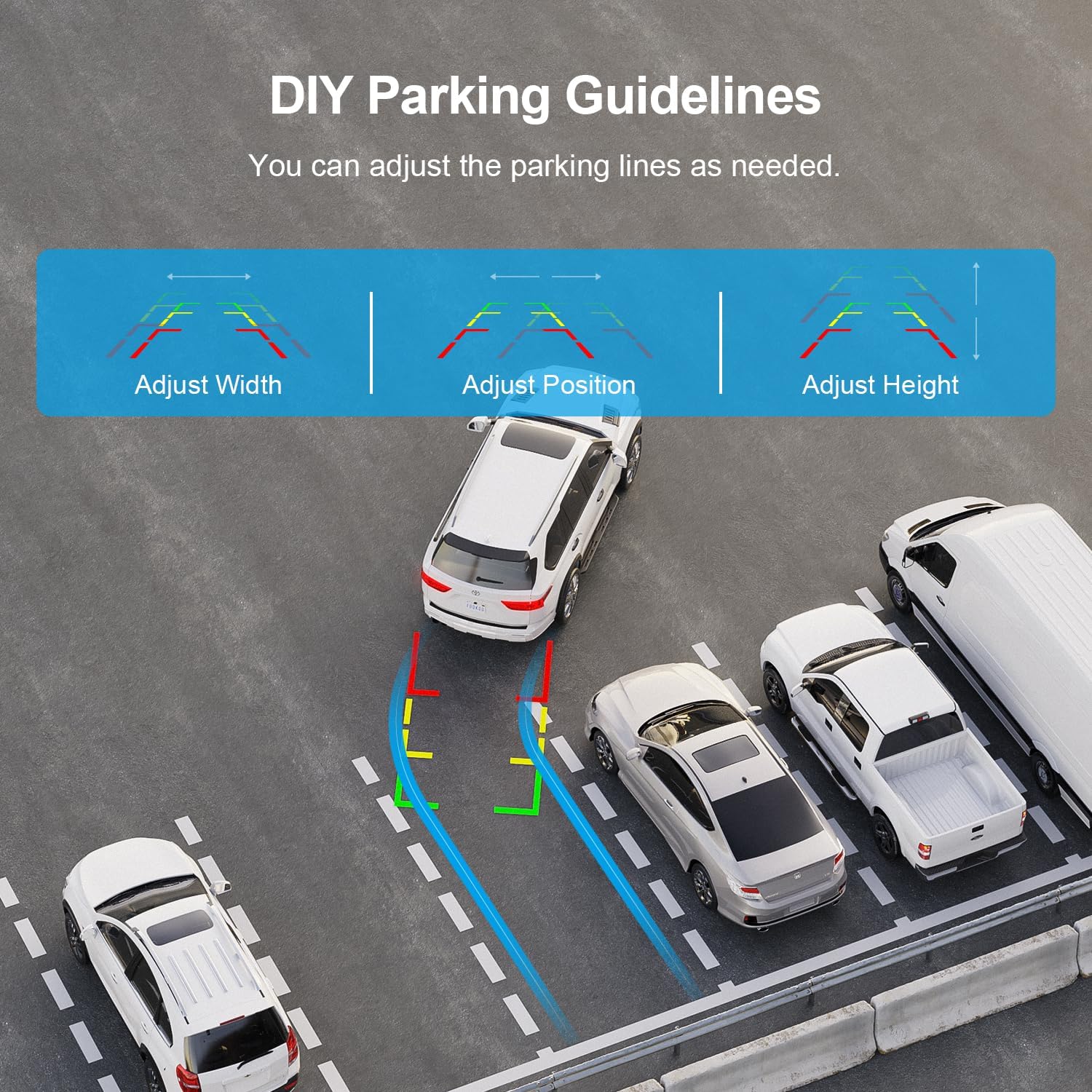 - DIY Parking Grid Lines: This wireless reversing camera system can adjusted the width, height and position of the parking grid lines, so you can move them up or down, left or right to suit your parking position and habits to ensure safe parking. It can also be turned off if not required. It is universal for most vehicles, such as cars/trucks/trailers/RVs/vans/SUVs/campers and so on, effectively avoiding any blind spots when driving on the road