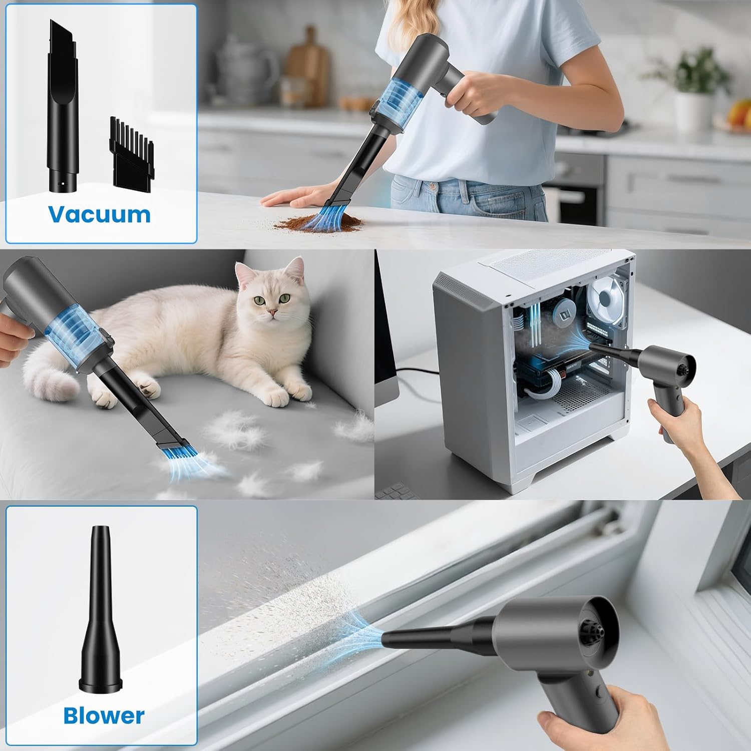 - Included Components : Handheld vacuum cleaner, upgraded pure copper brushless motor, 2 gear adjustable suction modes, 90° foldable design, various nozzles and attachments, mini vacuum, compressed air duster, blowing, inflating, pumping, vacuuming, metal filter, HEPA filters, fine steel dust cup, 6000mAh rechargeable battery, USB-C charging, Type-C charging cable See more