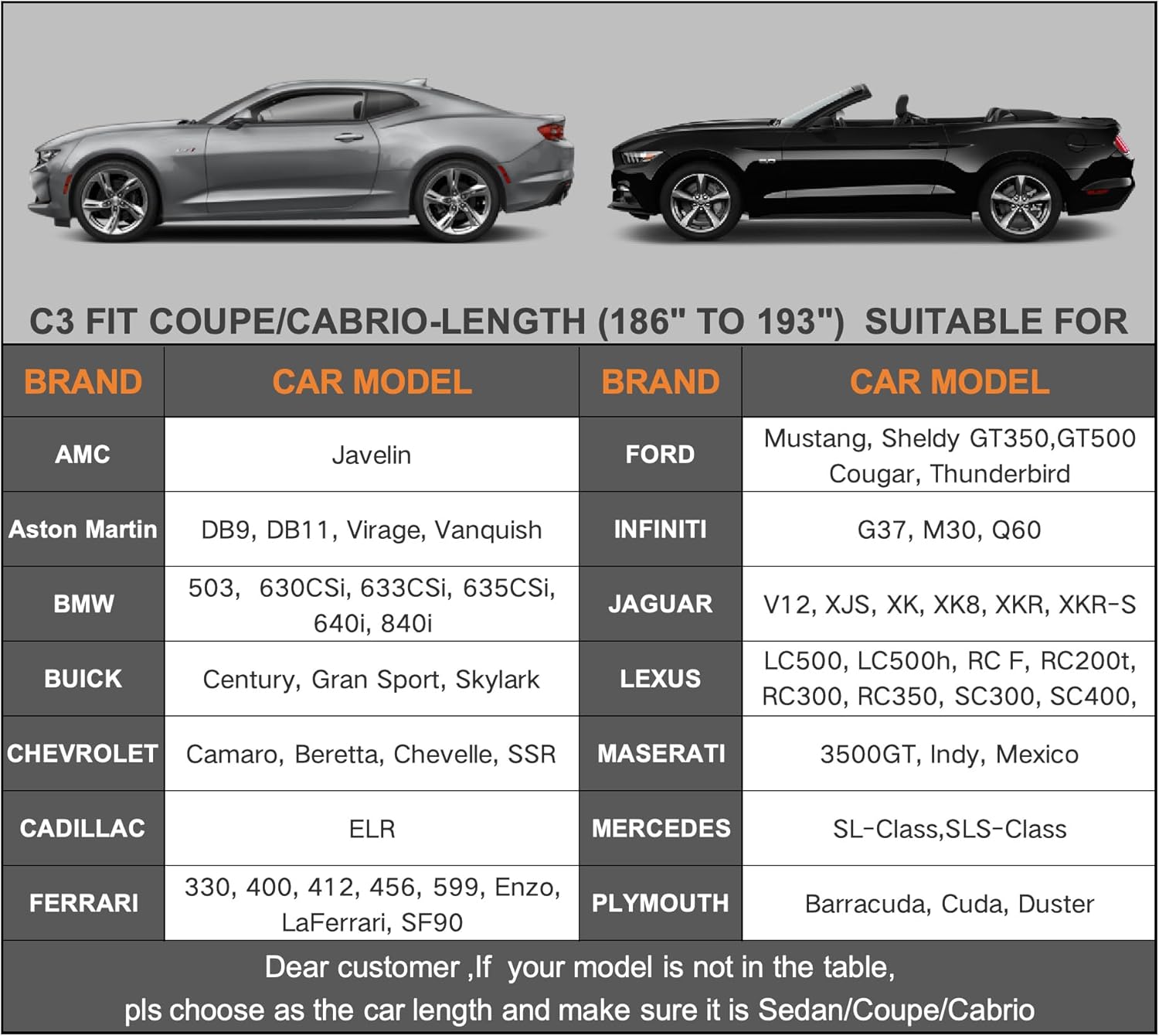 - 【Dimension C3】Universal fit for sedan/Coupe/Cabrio which length is 186-193 inch (Not for hatchback and SUV ). Suitable for Ford Mustang, Chevy Camaro Corvette, Lexus RC, LC500, Tesla model 3, etc.