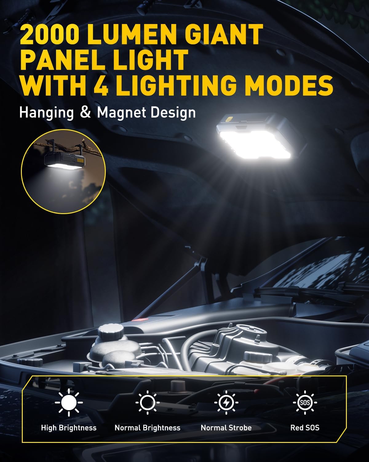 - SUPER BRIGHT PANEL LIGHT: Equipped with a super bright LED panel light offering 2000 lumens, AUXITO car starter jump box includes four lighting modes (Lighting, Strobe, and SOS) for maximum visibility in emergencies or while camping at night. With a built-in hook and a strong magnet, this portable car battery jump starter allows for hands-free operation