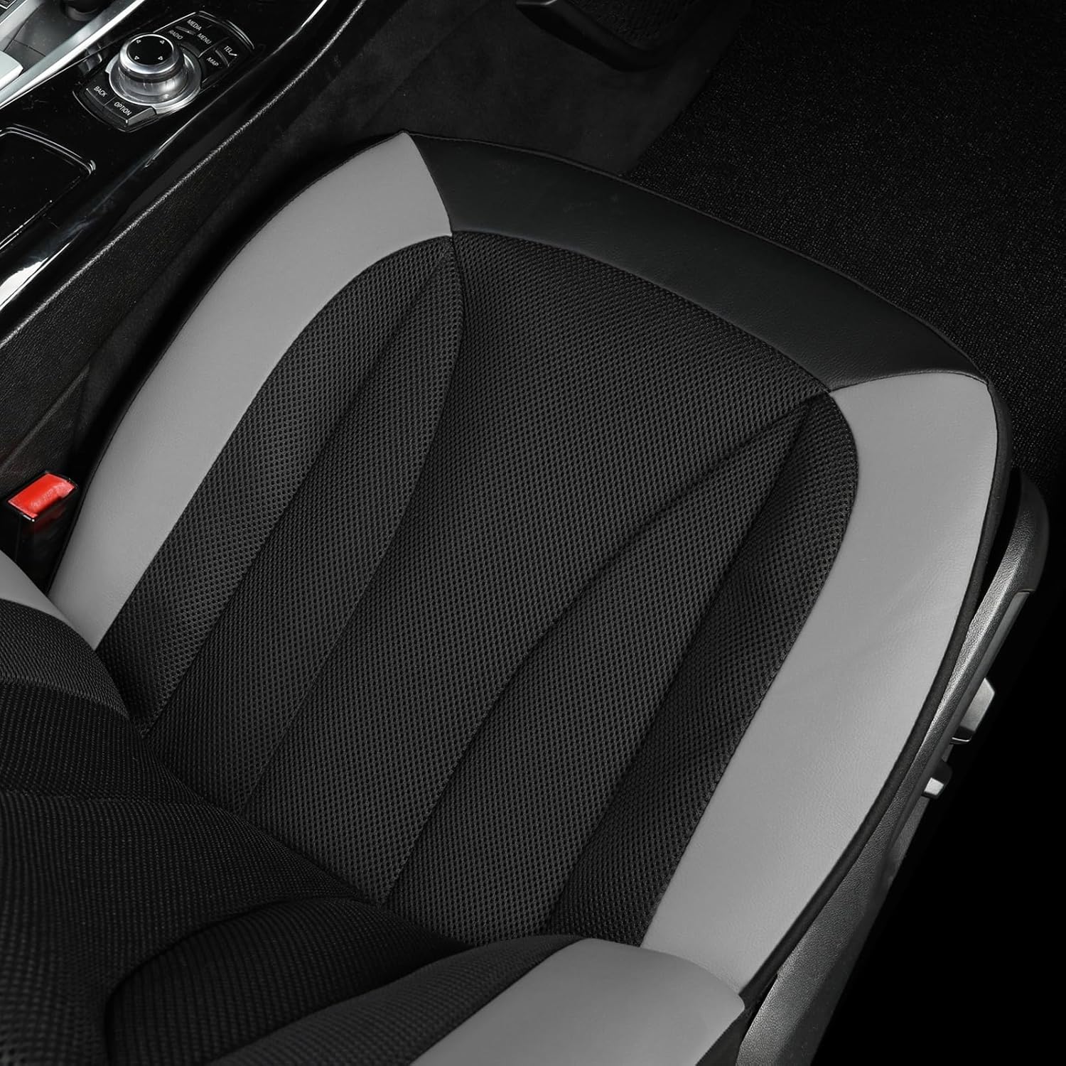 - Our car seat covers combine premium faux leather with breathable mesh fabric. The faux leather provides a luxurious look and durability, while the honeycomb mesh design on the backrest and seat ensures excellent breathability and cooling, keeping you comfortable during long drives and in hot weather.