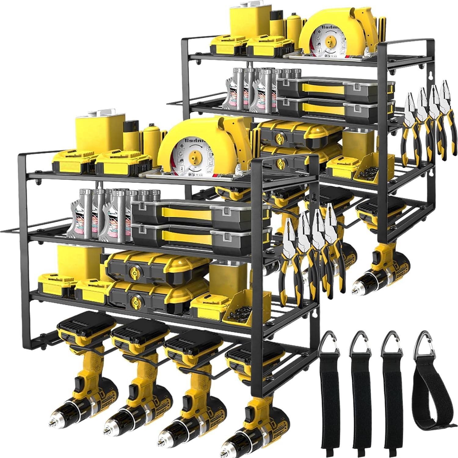Power Tool Organizer Wall Mount, 2 Pack 4 Layers Garage Wall Shelving, 8 Drill Holder Wall Mount, Cordless Tool Organizer, Garage Storage Rack with 4 Extension Cord Holder
