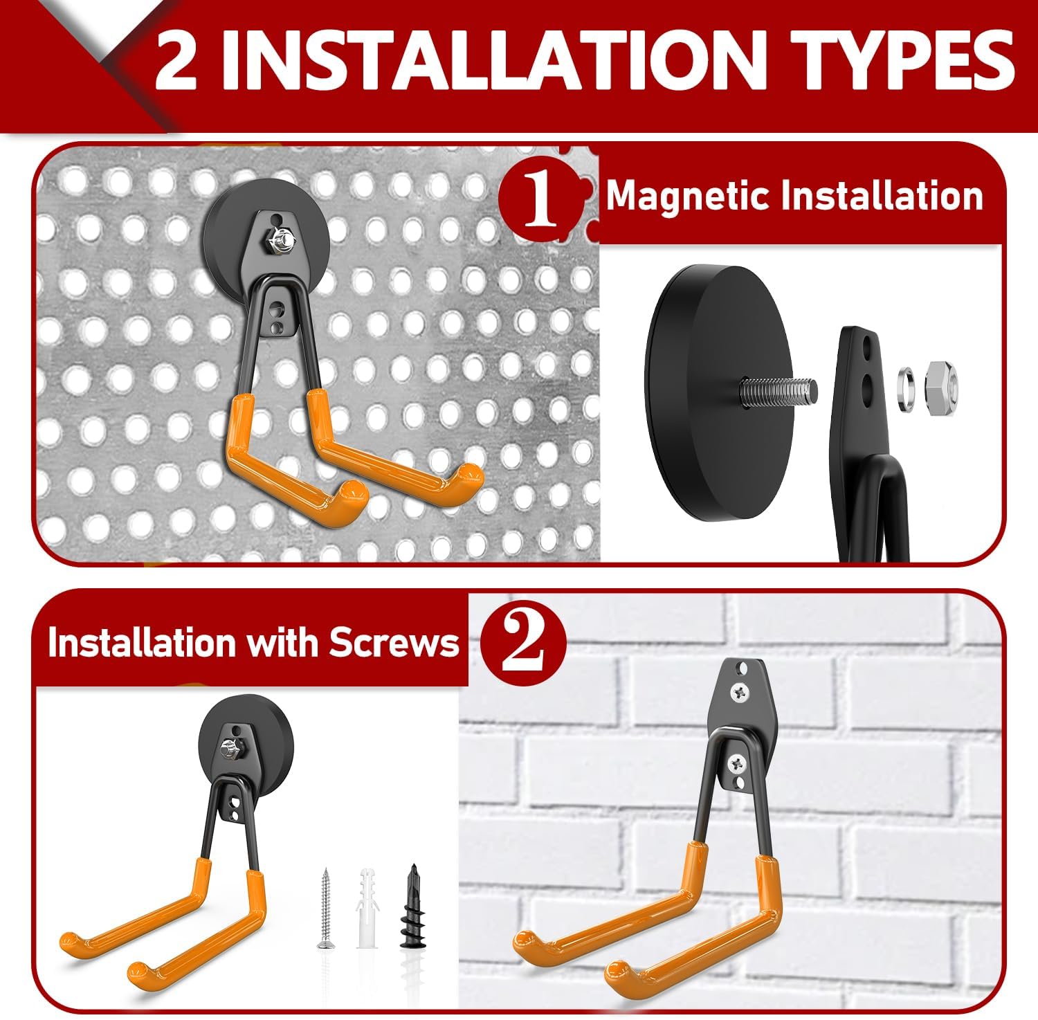 - Easy To Install Strong Heavy Duty Hooks: 2 usage options available: (1) heavy duty magnetic hooks for garage can be adsorbed on any metal surface. No tools, drilling, or screws are required for installation, ensuring no damage to the surface. (2) Alternatively, you can remove the magnet and use the garage storage hooks independently. For storing heavier tools, we provide sturdy screws that can be used to securely install the heavy duty hooks for garage on any wall surface