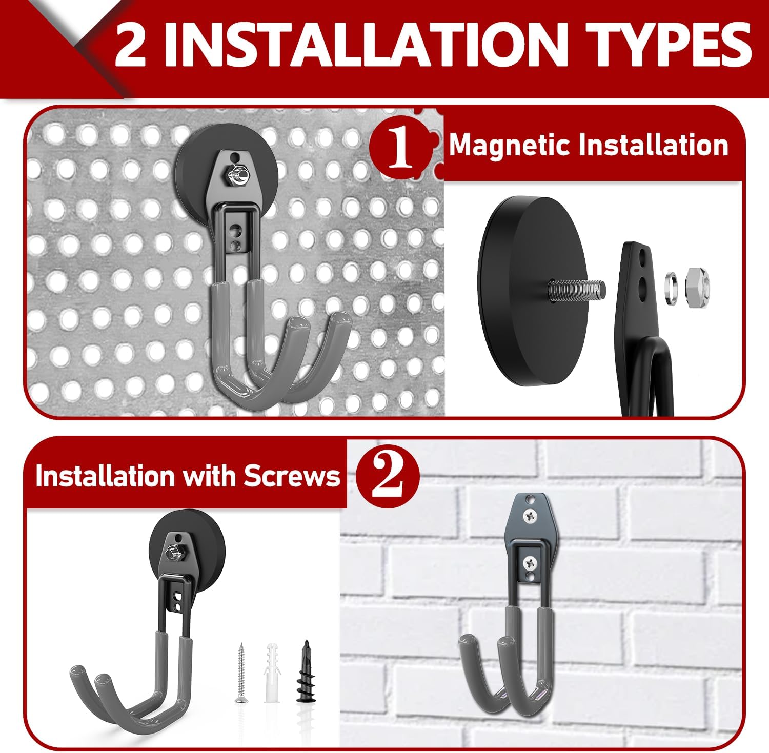 - Versatile and Effortless Installation: Enjoy the ease of our robust heavy duty hooks, offering two flexible usage options: (1) Perfect for metal surfaces, these garage magnetic hooks adhere simply without tools or drilling, ensuring no damage to the surface. (2) For enhanced versatility, the magnet can be detached, allowing independent use of the garage storage hooks. To securely store heavier tools, we provide robust screws that allow for a stable installation on multi-wall surface