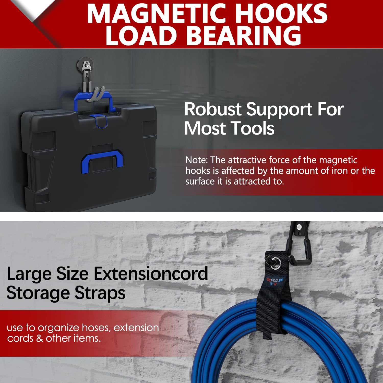 - Multi-functional Hook Magnets Heavy Duty: Your package includes 4 large J magnetic storage hooks, 2 extension cord organizer, and a comprehensive set of accessories comprising steel nails, flat washers, spring washers, and screws. For added convenience, the magnetic tool holder is accompanied by storage straps made of high-density nylon blend material with Velcro fastening, allowing for easy length adjustment and the hanging of various tools