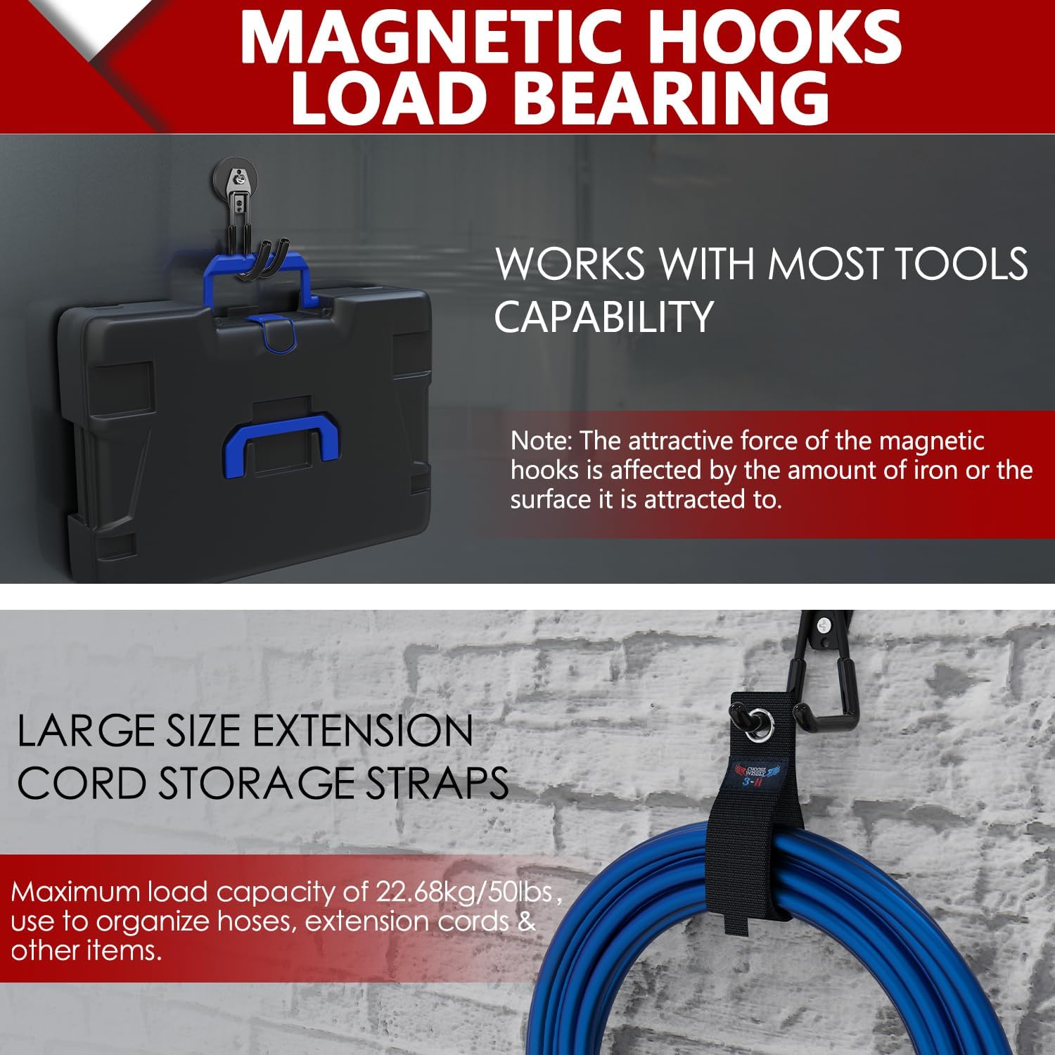 - Multi-functional Hook Magnets Heavy Duty: Your package includes 4 large J magnetic storage hooks, 2 extension cord organizer, and a comprehensive set of accessories comprising steel nails, flat washers, spring washers, and screws. For added convenience, the magnetic tool holder is accompanied by storage straps made of high-density nylon blend material with Velcro fastening, allowing for easy length adjustment and the hanging of various tools