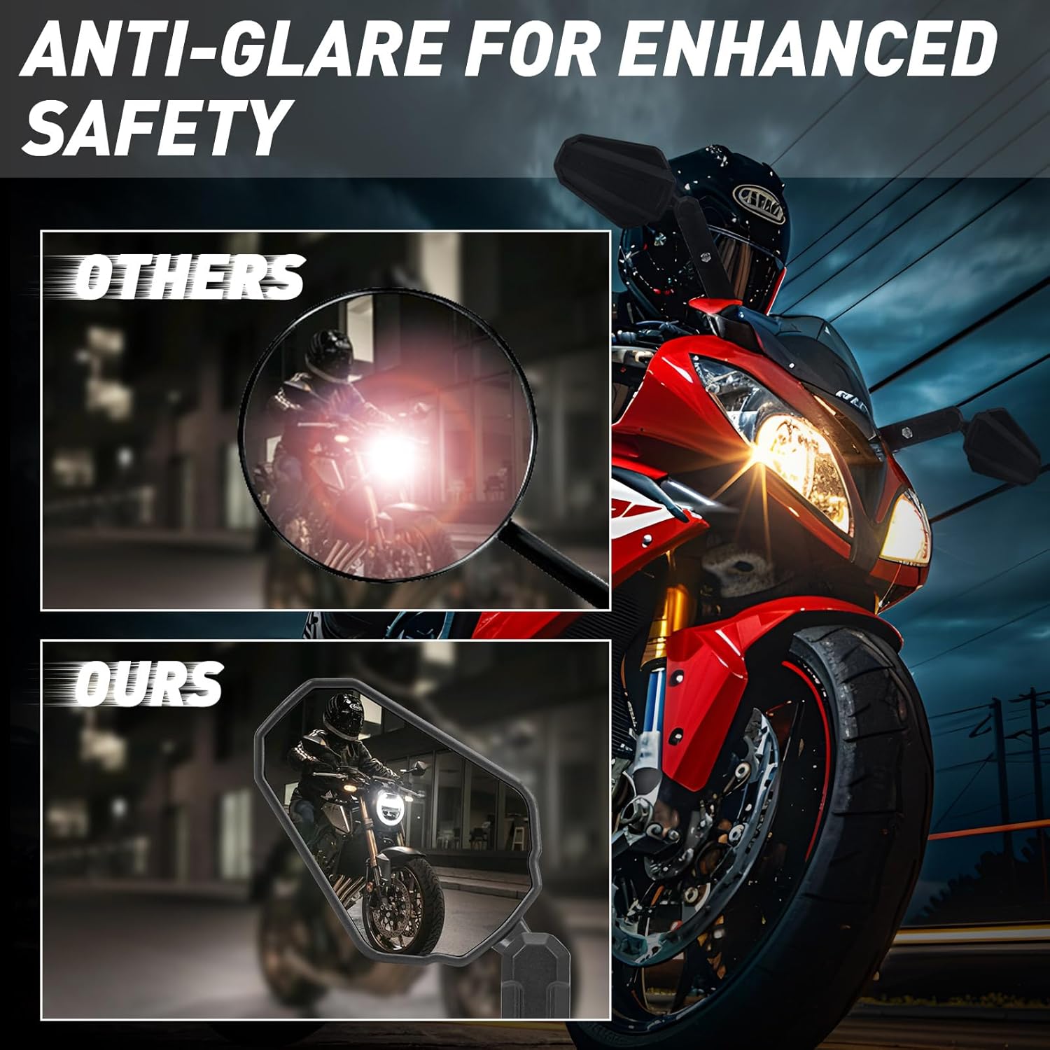 - 【Unique Foldable Design】Worried about your motorcycle mirrors hitting branches, rocks, or other obstacles during off-road rides or on narrow roads? With the NOVCAPAR foldable motorcycle rear view mirror, those concerns are a thing of the past! These motorcycle side mirrors easily fold in to reduce the width of your bike, making storage and transport a breeze. When mirrors aren't needed, simply fold them down to reduce wind resistance and avoid damage in tricky terrain. Enjoy a more exhilarating and worry-free ride with this innovative feature!