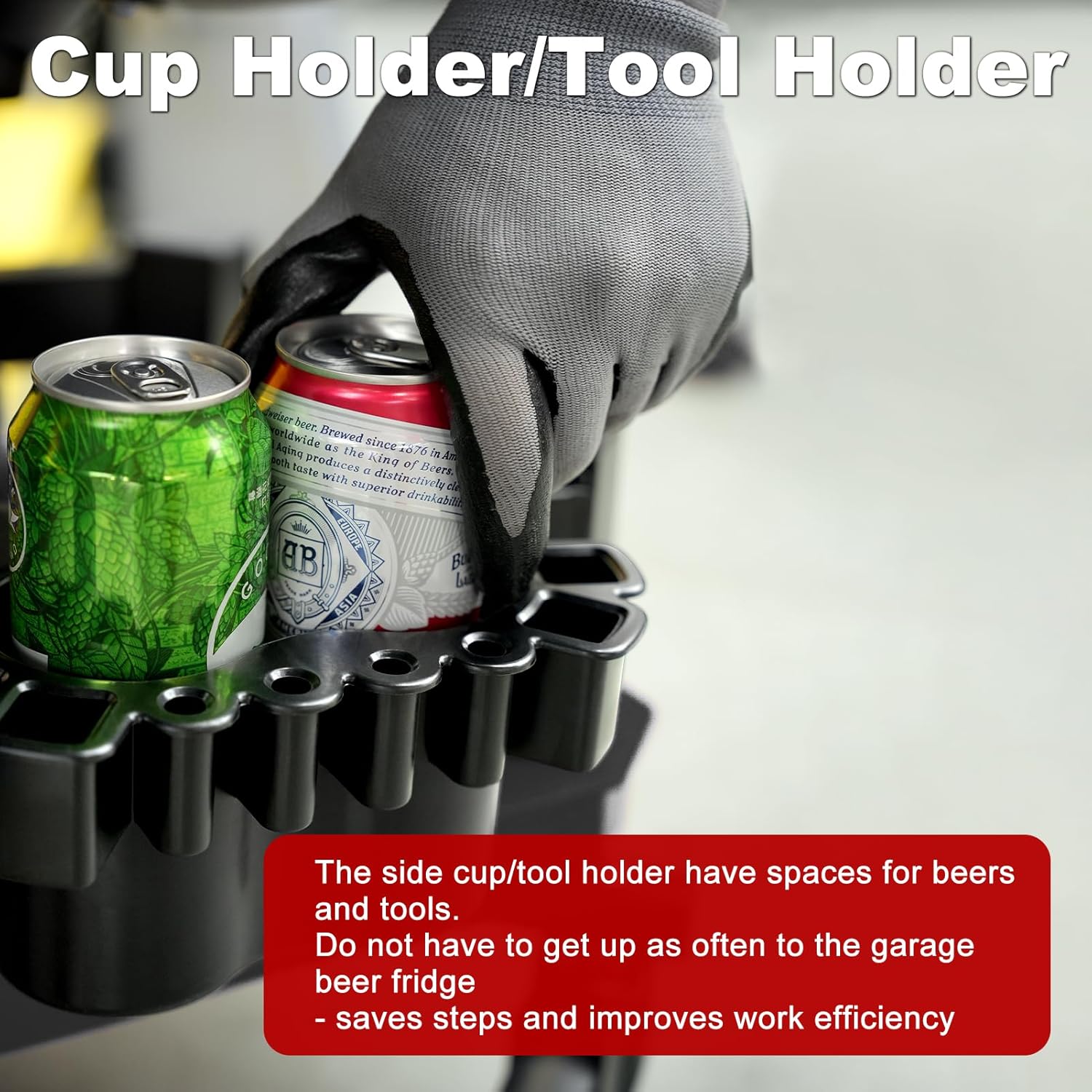 - 【ONE tool tray & TWO cup holders/tool holders】The garage stool has a very good storage function. There is a tool tray and two cup holders/tool holders. At the same time, the tool tray is equipped with a small partition space. You can put small tools like screws here. When you move, do not worry about the screws slipping out of range. It is convenient to store and access necessary tools and parts at anytime
