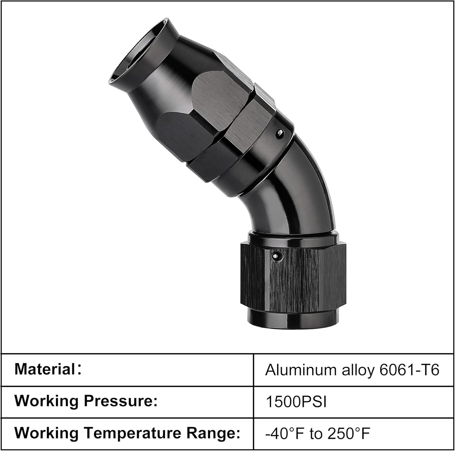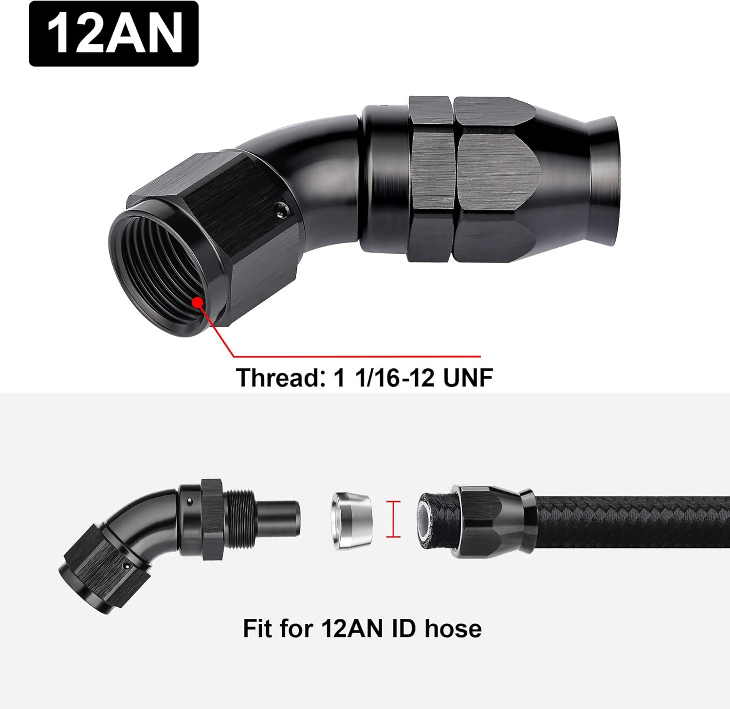 - [Product Size & Parameter] Size: 12AN. Thread Size: 11/16-12 UNF. Working Pressure: 1500PSI. Working Temperature Range: -40°F-250°F. Angle: 45 Degrees. Note: Please verify the hose size before purchase.