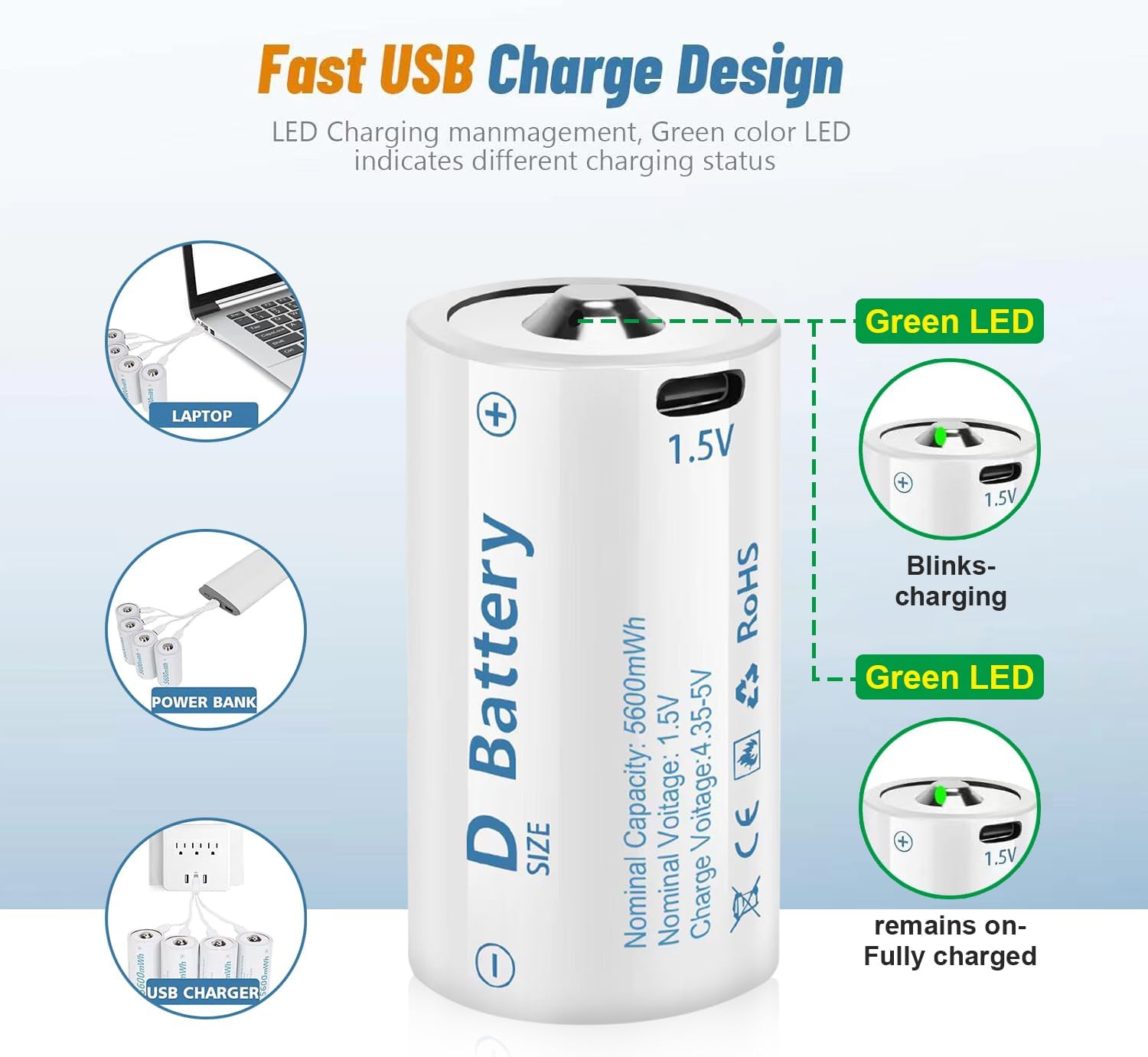 - 【 Rechargeable D Batteries】Rechargeable usb D battery with 1000+ cycles , save your big money comparing with the single use batteries.