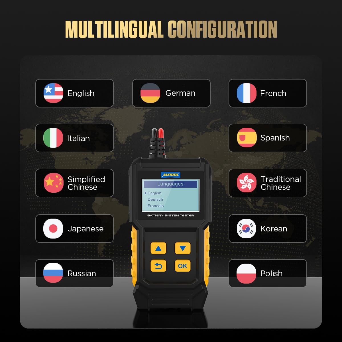 - 【Reliable Automotive Car Battery Tester】AUTOOL BT360 Battery Load Tester gives you reliable and overall battery parameters is a versatile battery analyzer that caters to your needs. It supports multiple languages, ensuring you can effortlessly understand your battery diagnostics, no matter where you are. such as voltage, internal resistance, cold cranking amp and AH capacity, battery health and charge status. Additionally, battery cca tester will also show you professional advice whether to replace or recharge the battery.