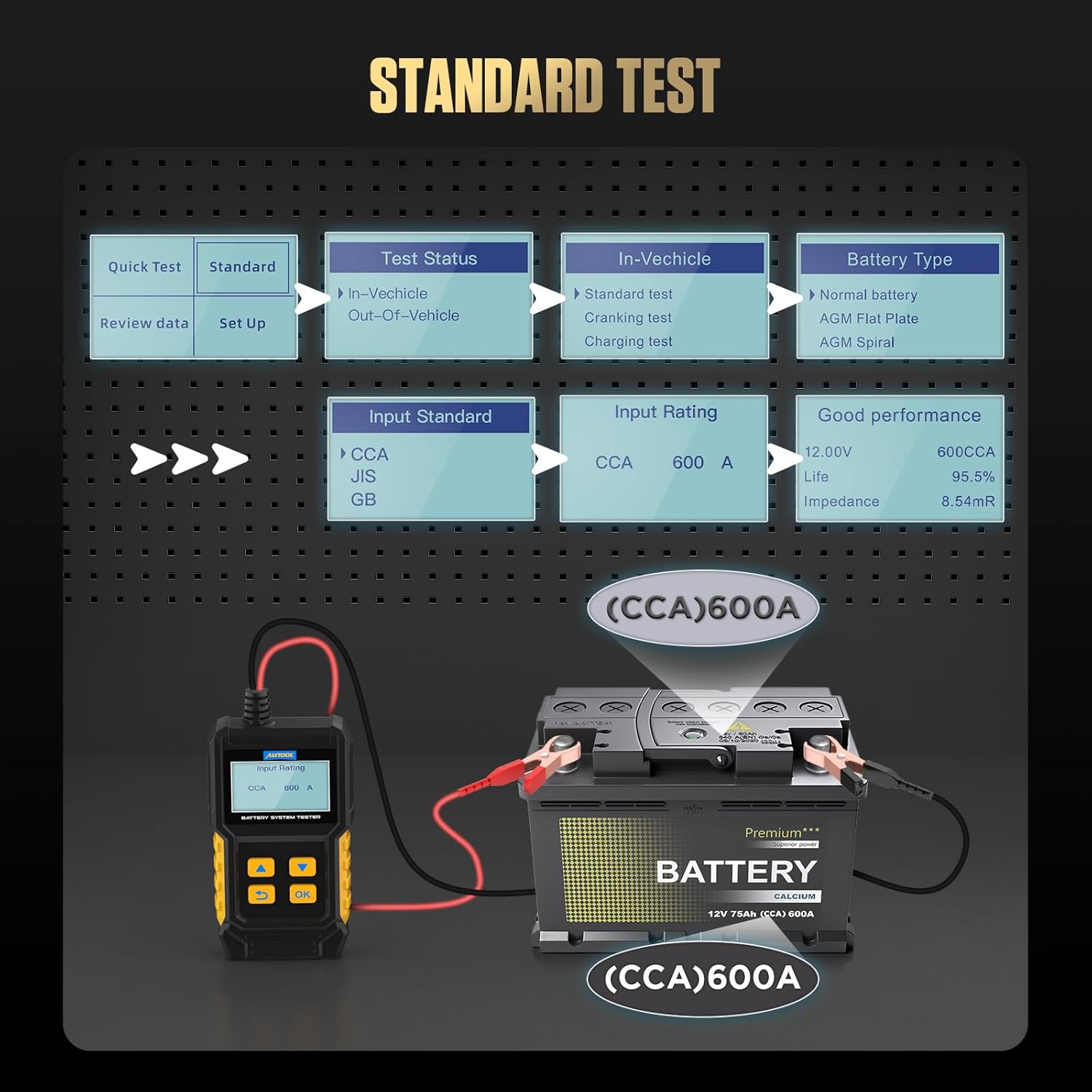 - 【Standard Test】When using this function, customers first need to know your battery type, such as Normal Battery, AGM Flat Plate, AGM Spiral, etc. After selecting the battery type, input the corresponding battery standard, such as CCA, BCI, GB, SAE, etc., and then choose the A parameter of the standard,for example,550A.