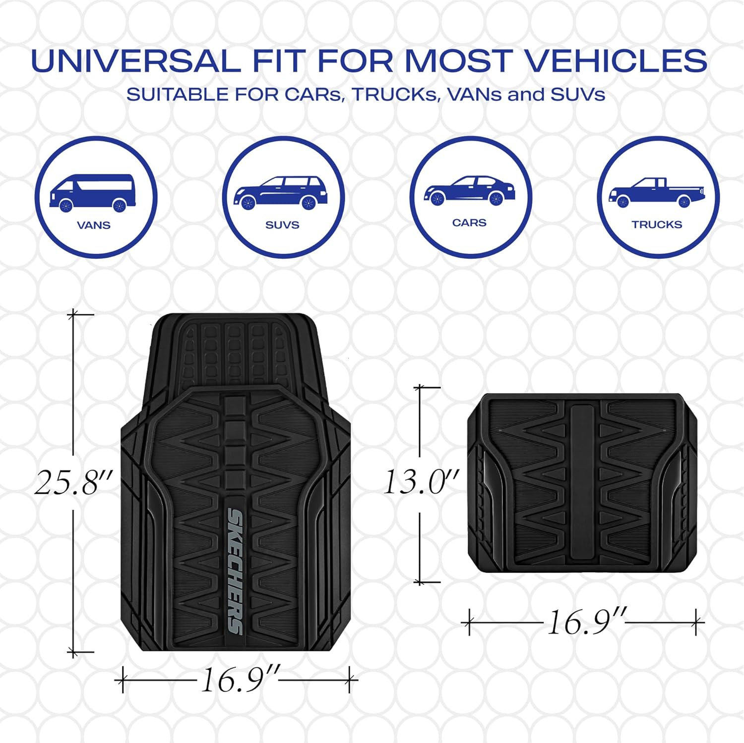 - CUSTOM FIT DESIGN-Engineered for quick and easy installation, Skechers Floor Mats are designed to fit most cars, trucks, pickups, and SUVs. The flexible universal liners can be easily trimmed with scissors to achieve a precise, custom fit for your vehicle, providing maximum protection and comfort. Enjoy a tailored look and enhanced durability with these adaptable floor mats