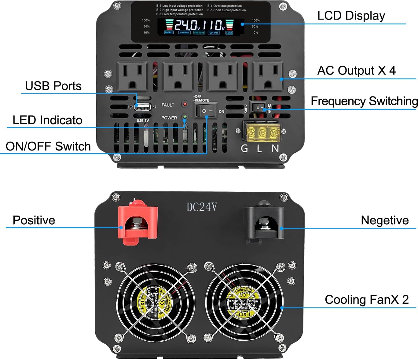 - 【Real-Time LCD for Performance Monitoring】Stay informed with a smart LCD display showing voltage, battery level, load, and alerts - essential for safe operation of any car inverter 24v to 120v system