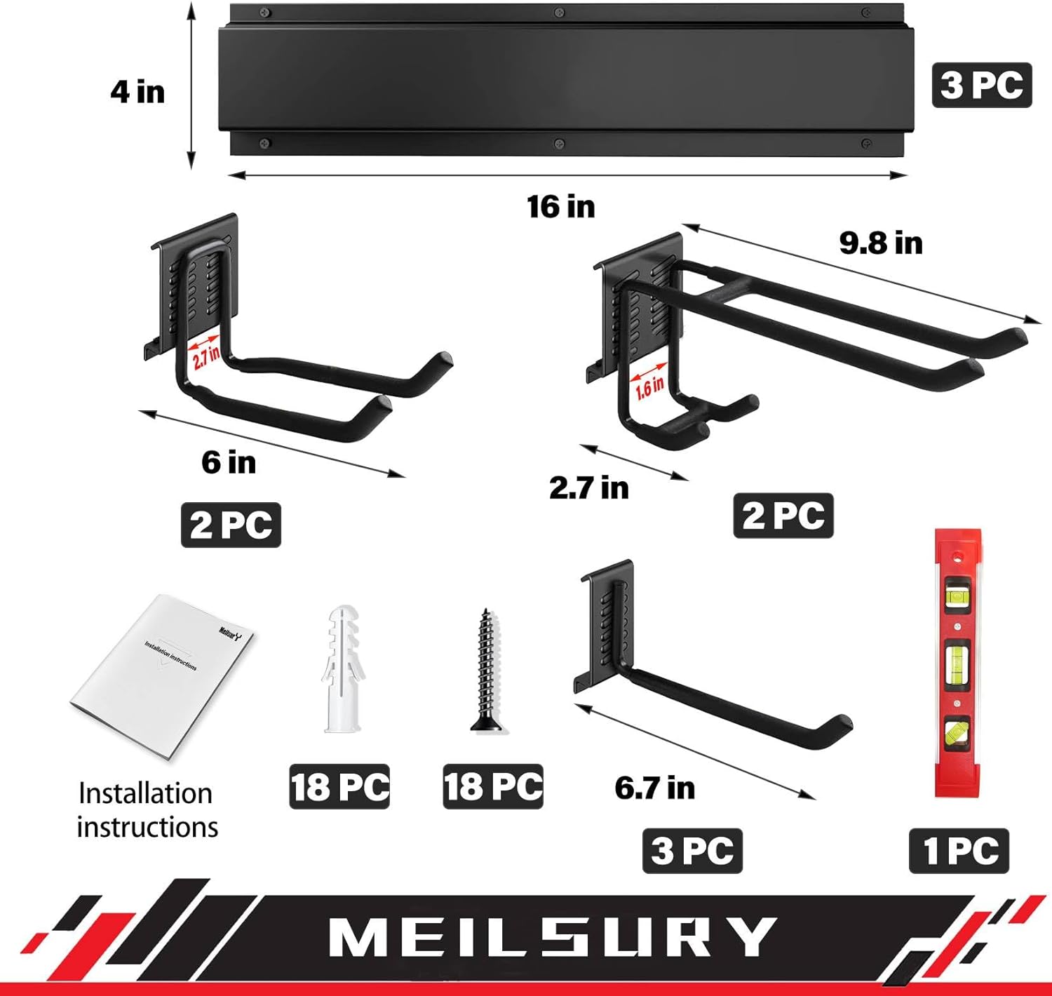 - Product Contains:Adjustable Garage Wall Mount Tool Rack with 7 hooks (2 tool hooks, 2 double hooks, and 3 single hooks) and 3 rails. It measures 48 inches in overall length and comes with a torpedo level for easy installation.