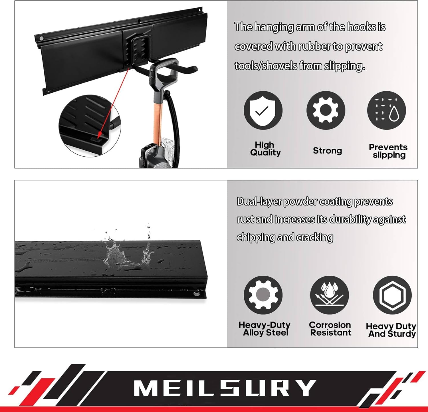 - Sturdiness Storage Rack: The materials used are heavy-duty alloy steel. this garage wall organizer is coated with a tough powder coating, making it resistant to corrosion and rust. The hooks on the hanging arms have rubber covers to prevent tools or shovels from slipping off. This rack has a maximum weight capacity of 440 lbs, making it strong enough , Additionally, it can be used both indoors and outdoors.