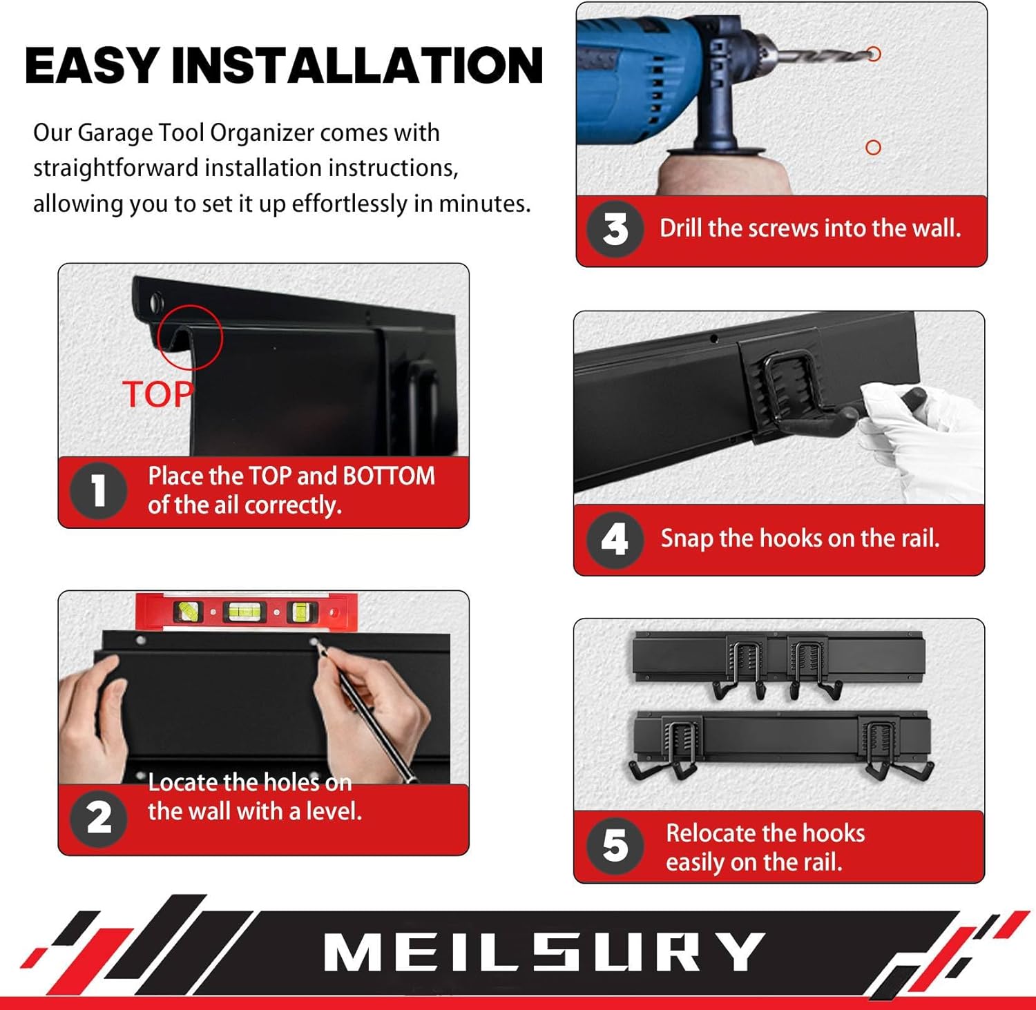 - Easy to install&change: this garage storage rack can be set up in minutes with no sweat. In no time, you'll have a tidy and practical tool wall. And if your storage needs change, the garage hooks can be easily moved around on the panel tracks.