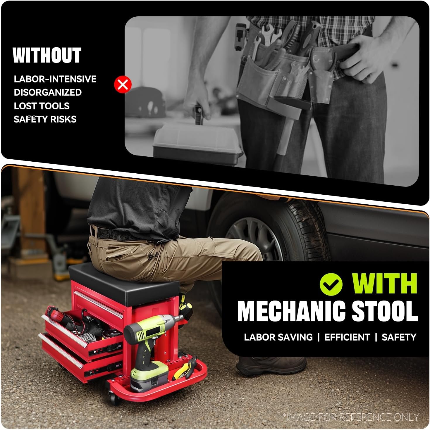 - Material: This 3-drawer rolling mechanics seat is made of reinforced metal, which can provide stability, equipped with a padded cushion that offers comfort for extended work sessions.