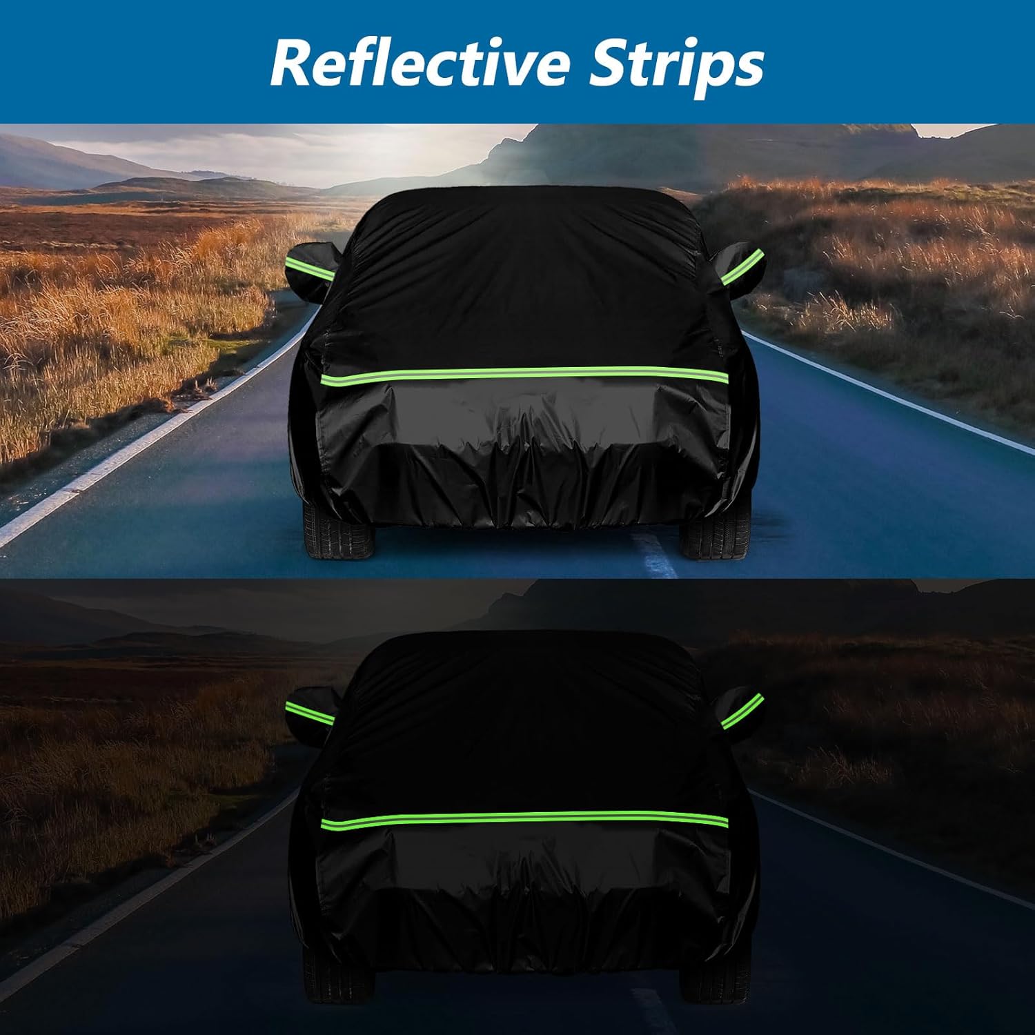 - 【Reflective Strips and Driver-Side Zipper Designs】(1) Black Coating: UV protection and heat-proof, prevent cracking and aging of inner decoration leather and plastic. (2)5 Reflective Strips attached on the front DRL lamps, middle Turning lights, and Rear taillight to prevent collisions during the night. (3)It has four straps, a windproof buckle, a security lock, and a storage bag. (4)Mirror Pocket: protect the rearview mirror in all directions. (5) A zipper on the cab side for convenience.