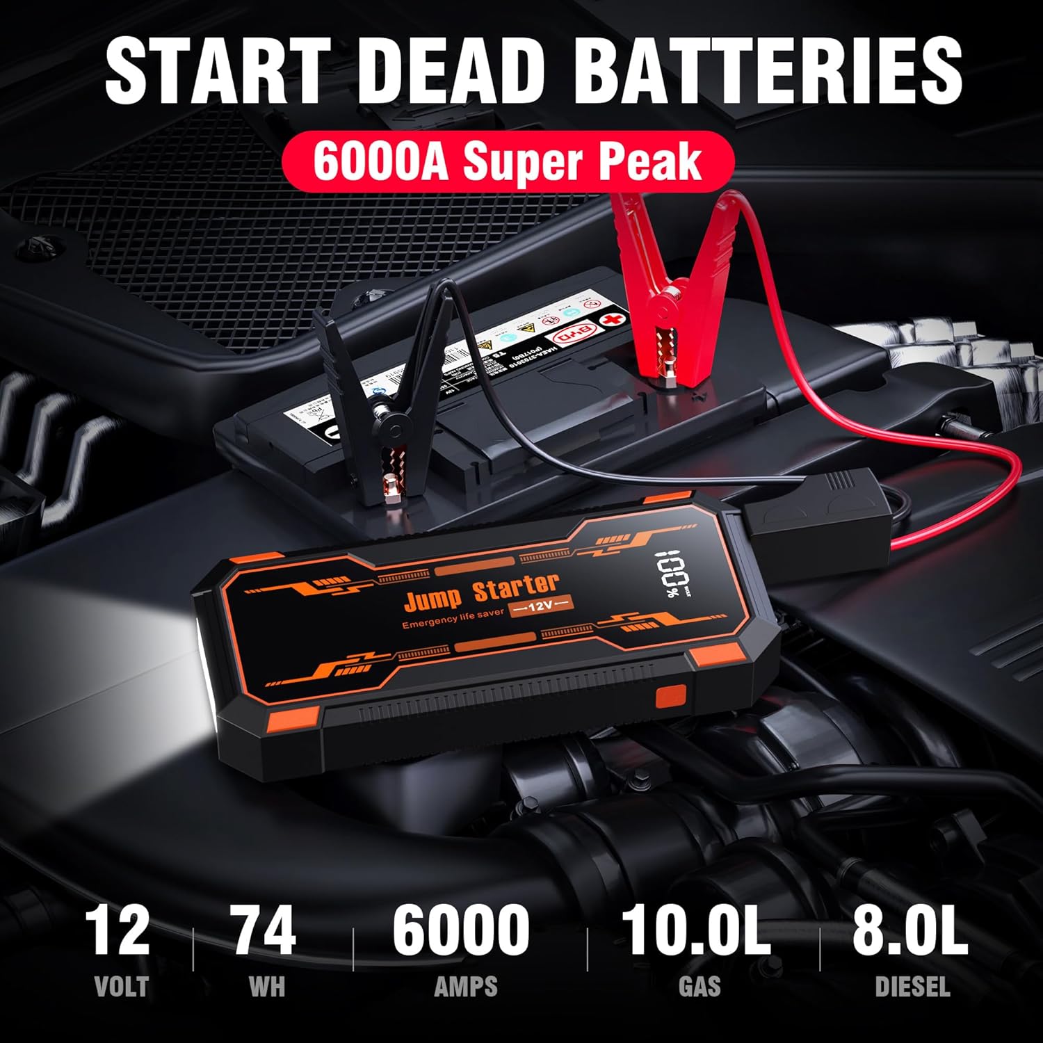 Car Jump Starter 6000A Car Battery Jump Starter Portable,12V Battery Jumper Starter Portable(10.0L Gas/8.0L Diesel),LCD Display Jump Box Jump Starter Battery Pack with Jumper Cable&Flashlight-Orange
