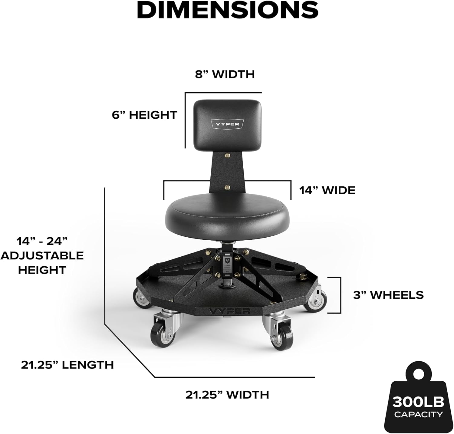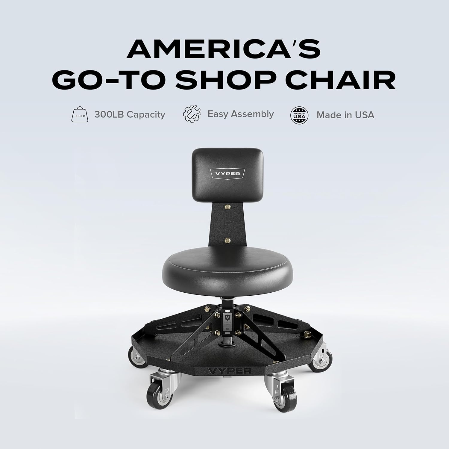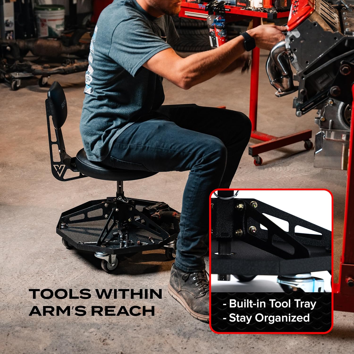 Vyper Robust Steel Sport Shop Chair for Mechanics, Automotive, DIY - 300 lb Capacity Garage Stool with Backrest & Large Wheels (Black Seat, Black Frame)