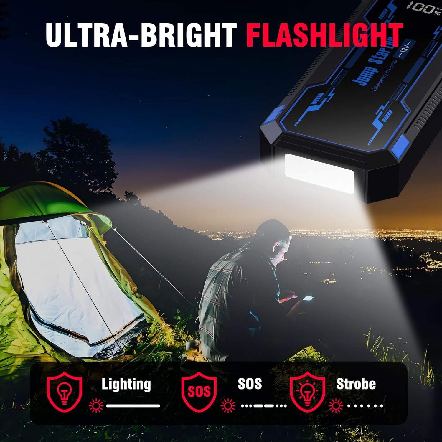 - 【Ultra-Bright Emergency LED Flashlight】The high lumens flashlight with light/strobe/SOS 3 lighting modes give you 100% visibility at night. In an emergency, this car jumper battery pack is a reassuring lifesaver in the dark when camping, hiking, or on an adventure trip. Unique led display can detect and display the operational status and battery level.