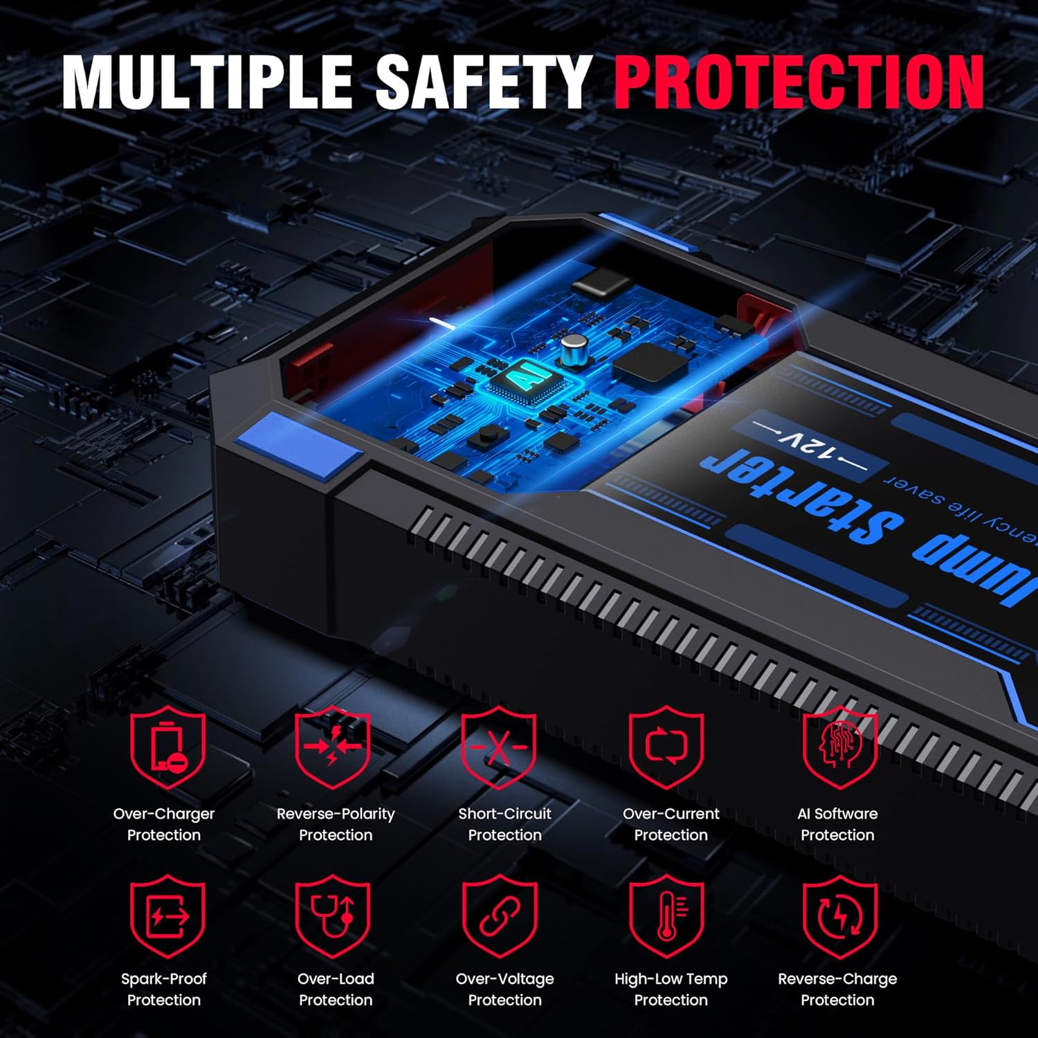 - 【Smart IC and Ultra Safe Design】More performs in safety efficiency and compatibility etc with Advanced intelligent controlling IC 100% checked and continuous aging test which it will brings you unprecedented convenience. Upgraded Built-in 10 multi-protection system and premium microchips to ensure your safety to the maximum. Trustworthy Car Battery Jump Starter with 3 Years Warranty!