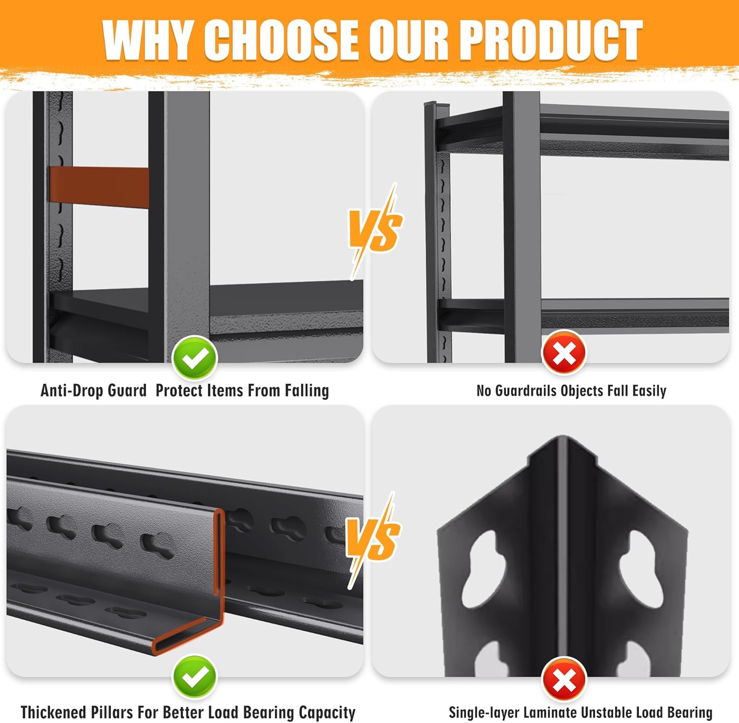- STABILITY AND SAFETY:When choosing garage shelves,one of our biggest concerns is stability,we want it to store heavy items safely without shaking or tipping over,I'm happy to tell you that this heavy duty shelves can meet your requirements in all aspects,its structure is very stable and sturdy,preventing any accidents from happening,now you can rest assured that our items are Safe, it will not fall over.