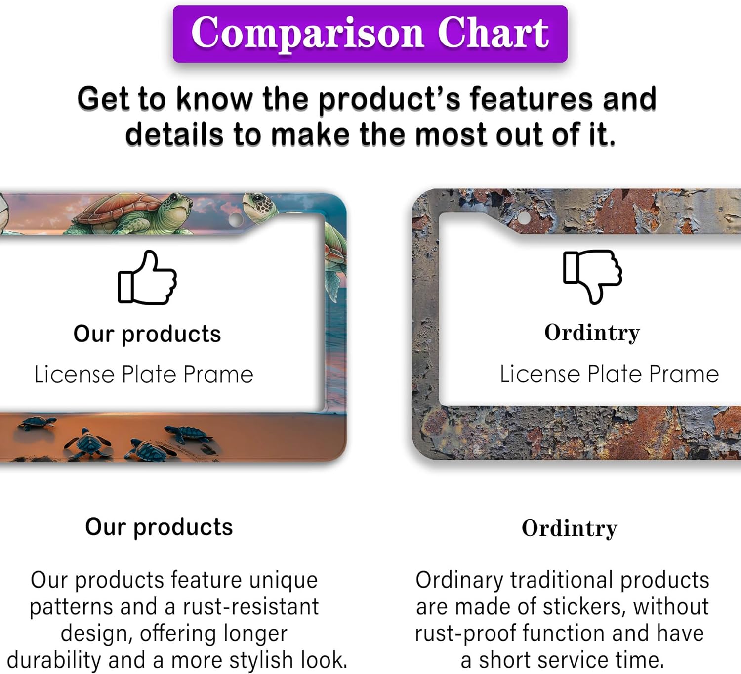 - ALUMINUM FRAME: This License Plate Frame is crafted from high-quality aluminum that is resistant to corrosion, rust, and harsh weather conditions. Its rugged reliability design ensures a long lifespan, making it capable of withstanding car washes and extreme weather, providing you with a reliable and stylish solution for your vehicle.