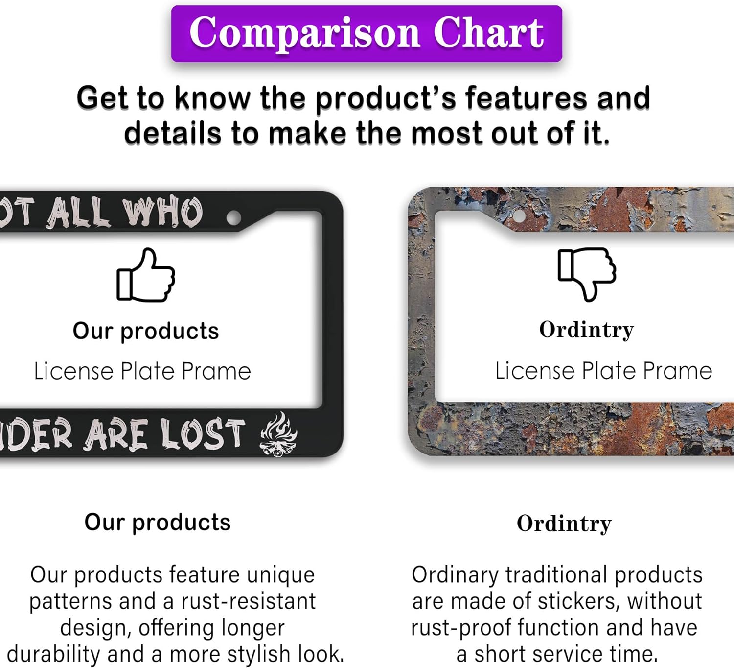 - ALUMINUM FRAME: This License Plate Frame is crafted from high-quality aluminum that is resistant to corrosion, rust, and harsh weather conditions. Its rugged reliability design ensures a long lifespan, making it capable of withstanding car washes and extreme weather, providing you with a reliable and stylish solution for your vehicle.