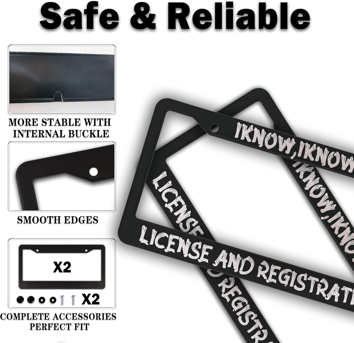 Front License Plate Bracket Black and White License Plate Frames I Know I Know License and Registration Universal Aluminum Car Accessory 2 Pack with Screw Covers Set