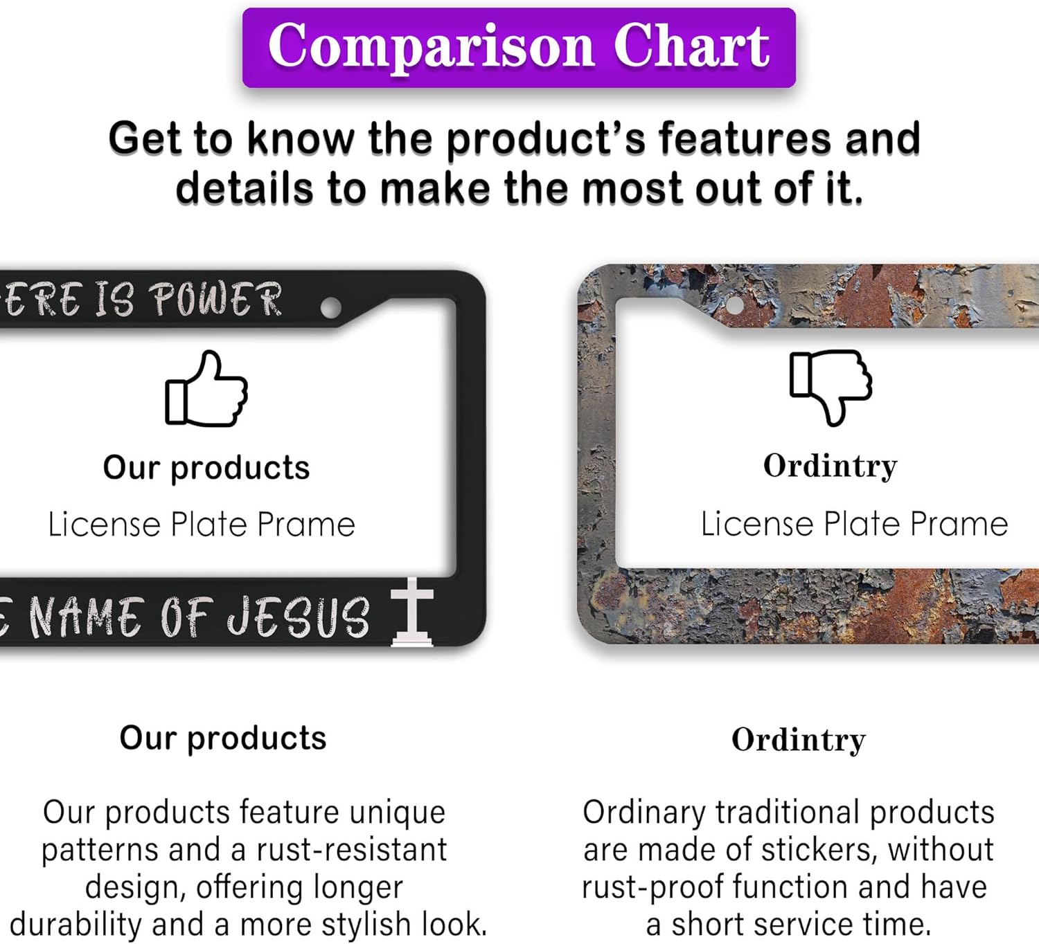 - ALUMINUM FRAME: This License Plate Frame is crafted from high-quality aluminum that is resistant to corrosion, rust, and harsh weather conditions. Its rugged reliability design ensures a long lifespan, making it capable of withstanding car washes and extreme weather, providing you with a reliable and stylish solution for your vehicle.