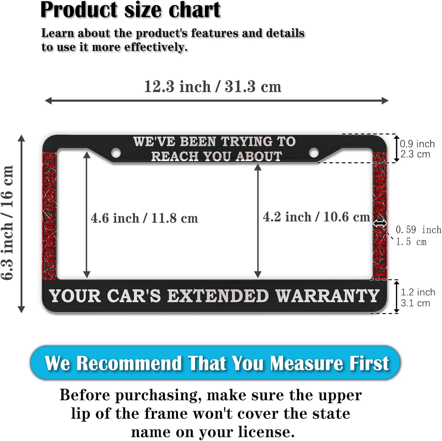 - STANDARD FRAME SIZE: Ensure a perfect fit by checking the dimensions to avoid covering your state name. These frames are specifically designed to fit standard American license plates measuring approximately 12.3" x 6.3" (16 x 31 cm). for most license plates in the U.S.