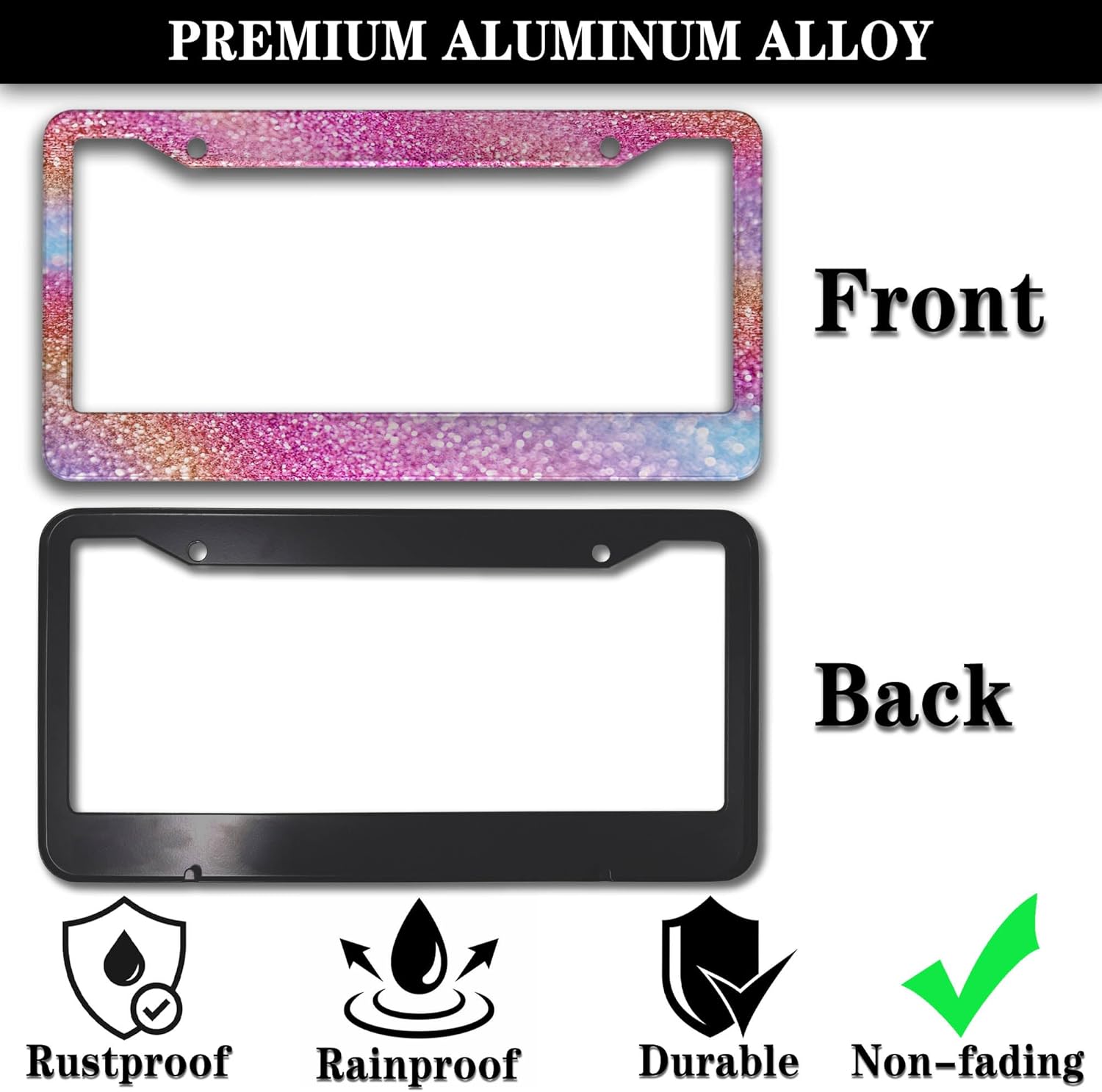 License Plate Frame Multicolor License Plate Holder Shining Rainbow Gradient Sparkle Glitter Women Aluminum Metal Car Accessory 2 Pack with Screw Covers Set