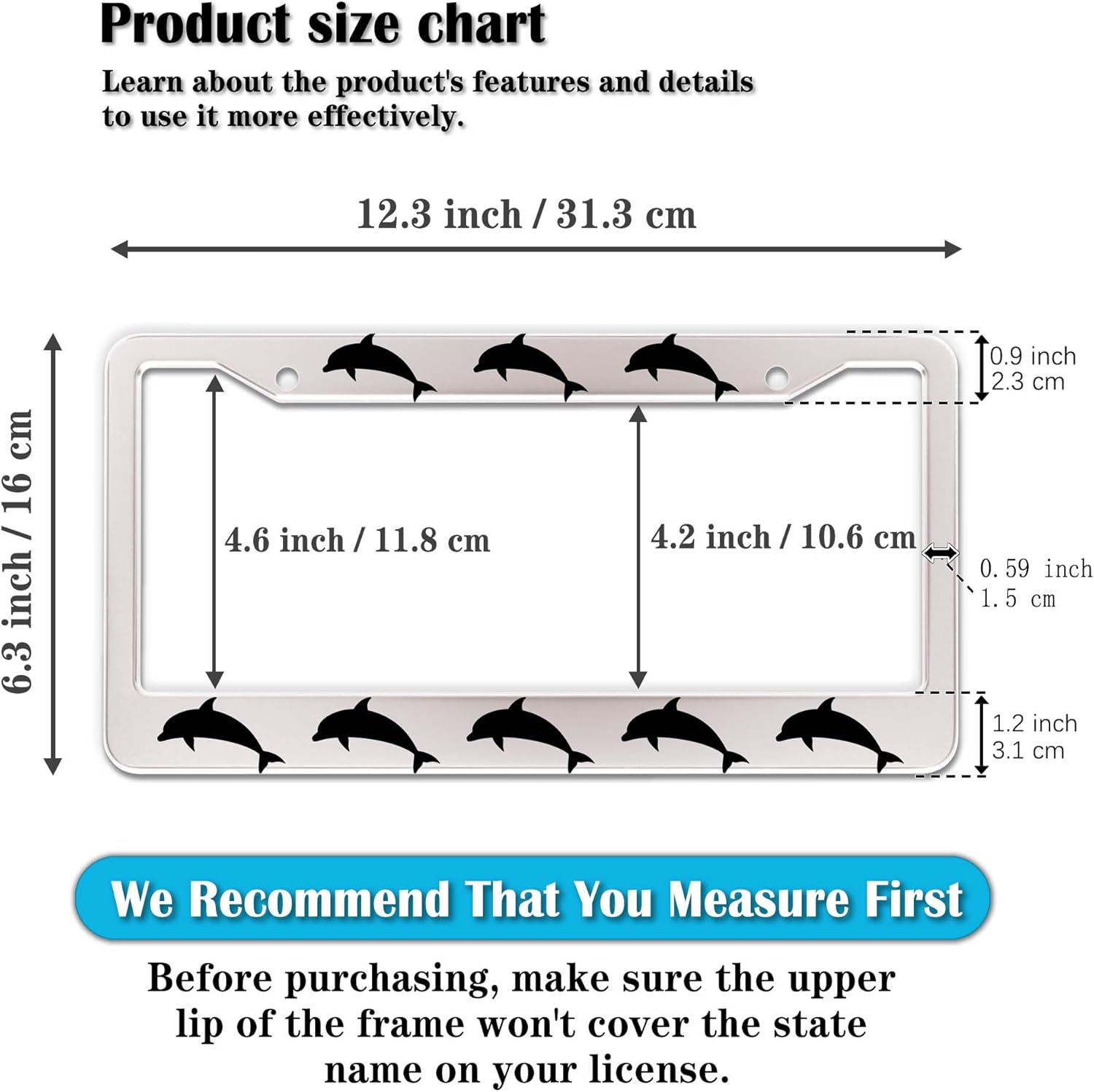 - STANDARD FRAME SIZE: Ensure a perfect fit by checking the dimensions to avoid covering your state name. These frames are specifically designed to fit standard American license plates measuring approximately 12.3" x 6.3" (16 x 31 cm). for most license plates in the U.S.
