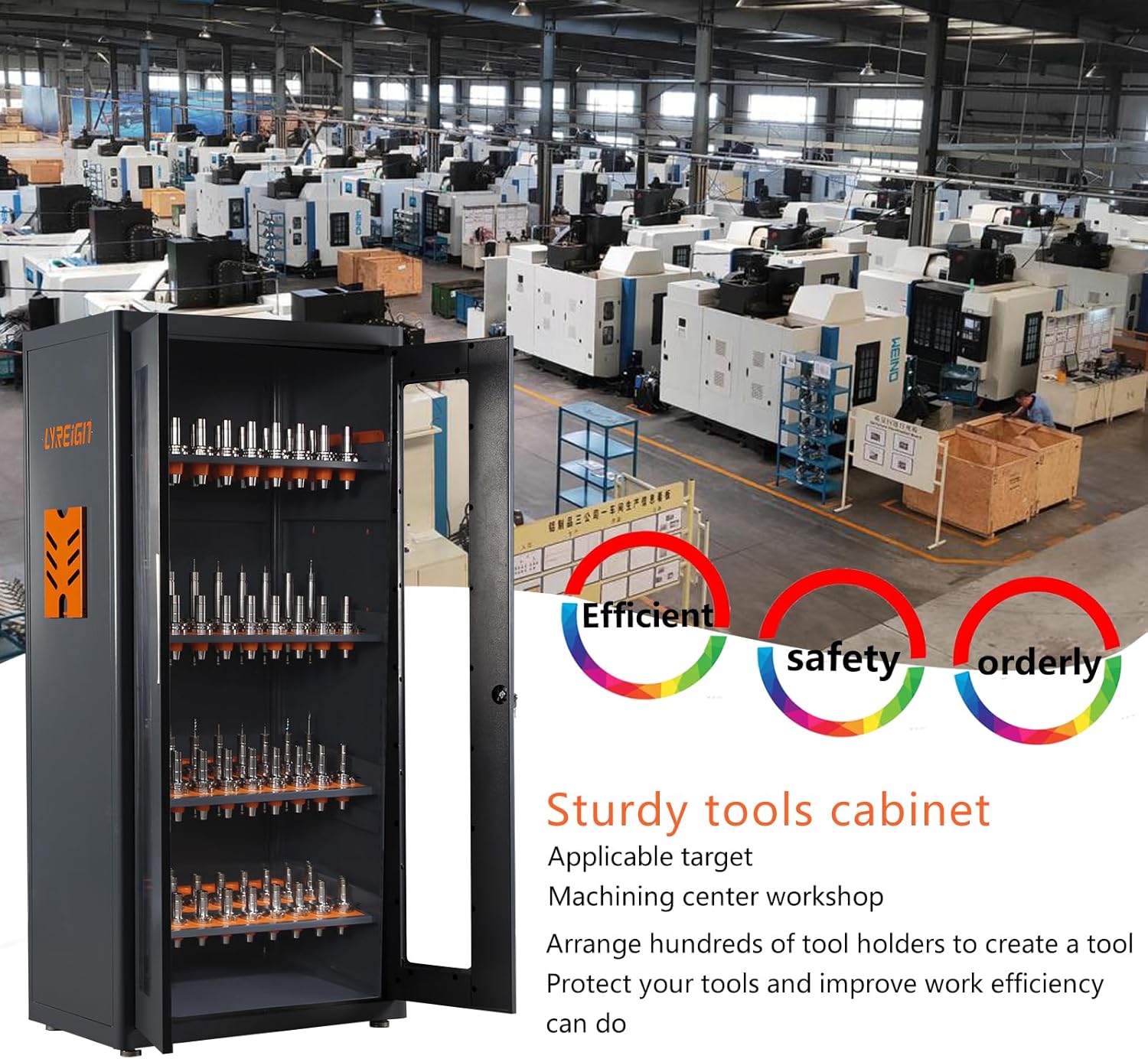 - PERFECT DESIGN: LYREIGN CNC tool holder is specially designed for CNC machinists and workers. The design drawing pocket is installed on the side of the cabinet to place documents, and the widening handle is convenient for opening the door. The lockable door is safe and anti-lost, and the Transparent acrylic windows clearly visible. Tool holder Cabinet can accommodate 84 pieces of CAT50 tools and can bear a weight of 1200kg. Model: CAT50/BT50-84CAP. Size: 33.4"L x 21.6"W x 72"H.