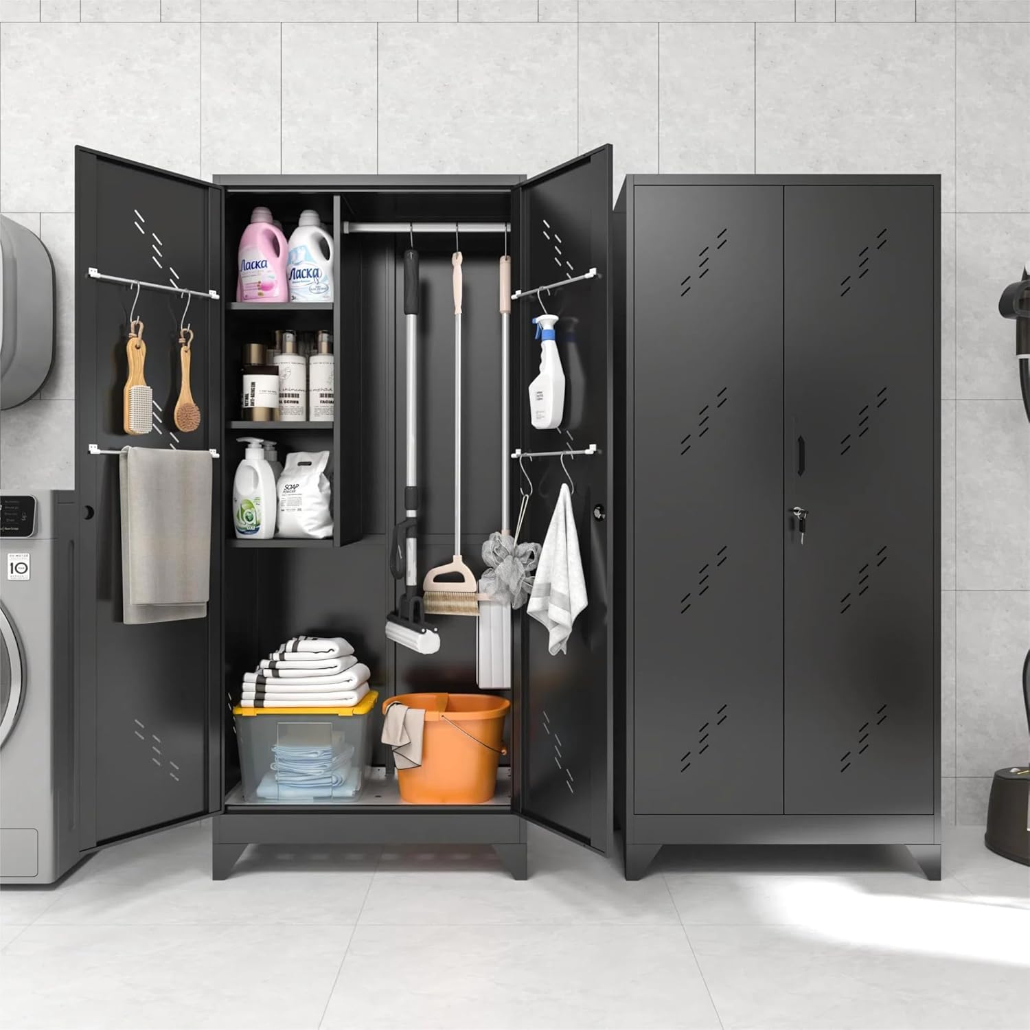 - 【Wide Applications】Lockable steel cleaning storage cabinet is widely used in office, school, archives, fire administration,garages, industrial plant, gym, cleaning company,basements or anywhere secure storage space is required.You can store brooms, mops, car cleaning tools, cleaners, shovels, vacuum cleaners. It's easy to find tools quickly, and it also makes your room more tidy