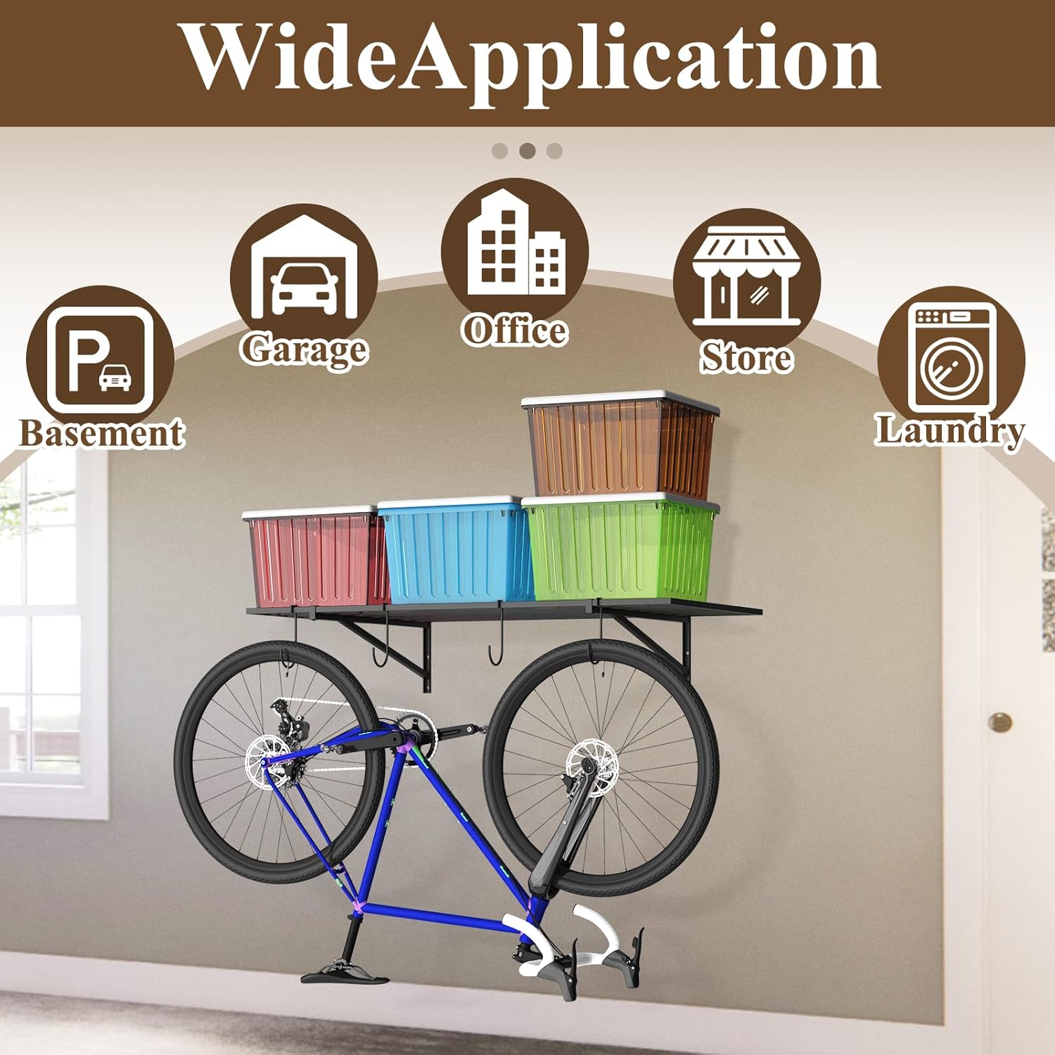 - 🔧Save Space & Superb Strength: The large wall-mounted shelves optimizes your garage space, perfect for storing various items like storage bins, boxes, tires, sporting goods, and more. Constructed from alloy steel square tubing frame, each shelf can support up to 260 lbs.