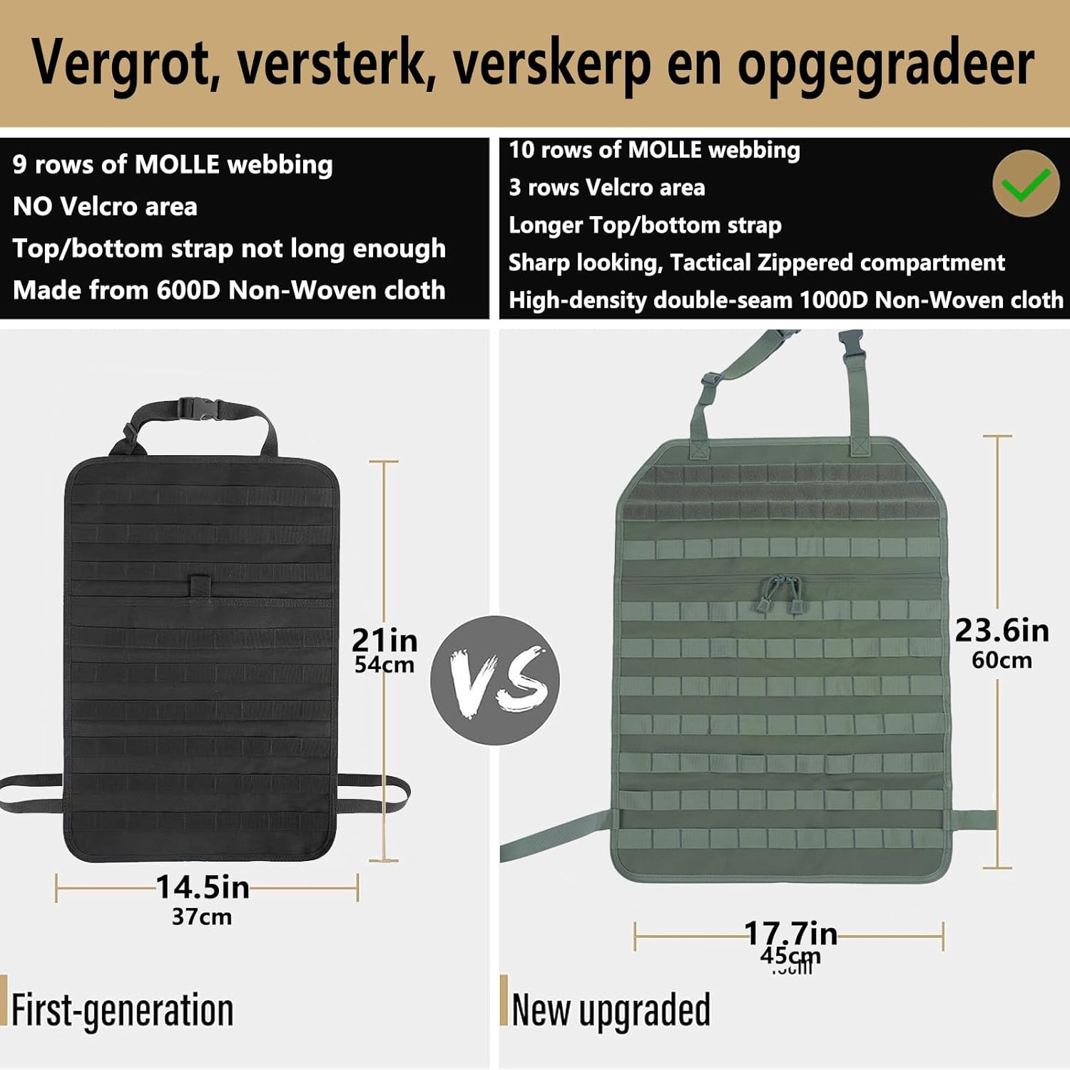 - 🚗 Multifunctional Storage - Design with 5 Molle bags on the back to help you store tactical gear & personal items and save space. Difference sizes of Molle bags help you classify your items so easily.you can set the Tactical Seat ​Back Organizer according to your own habits and need.