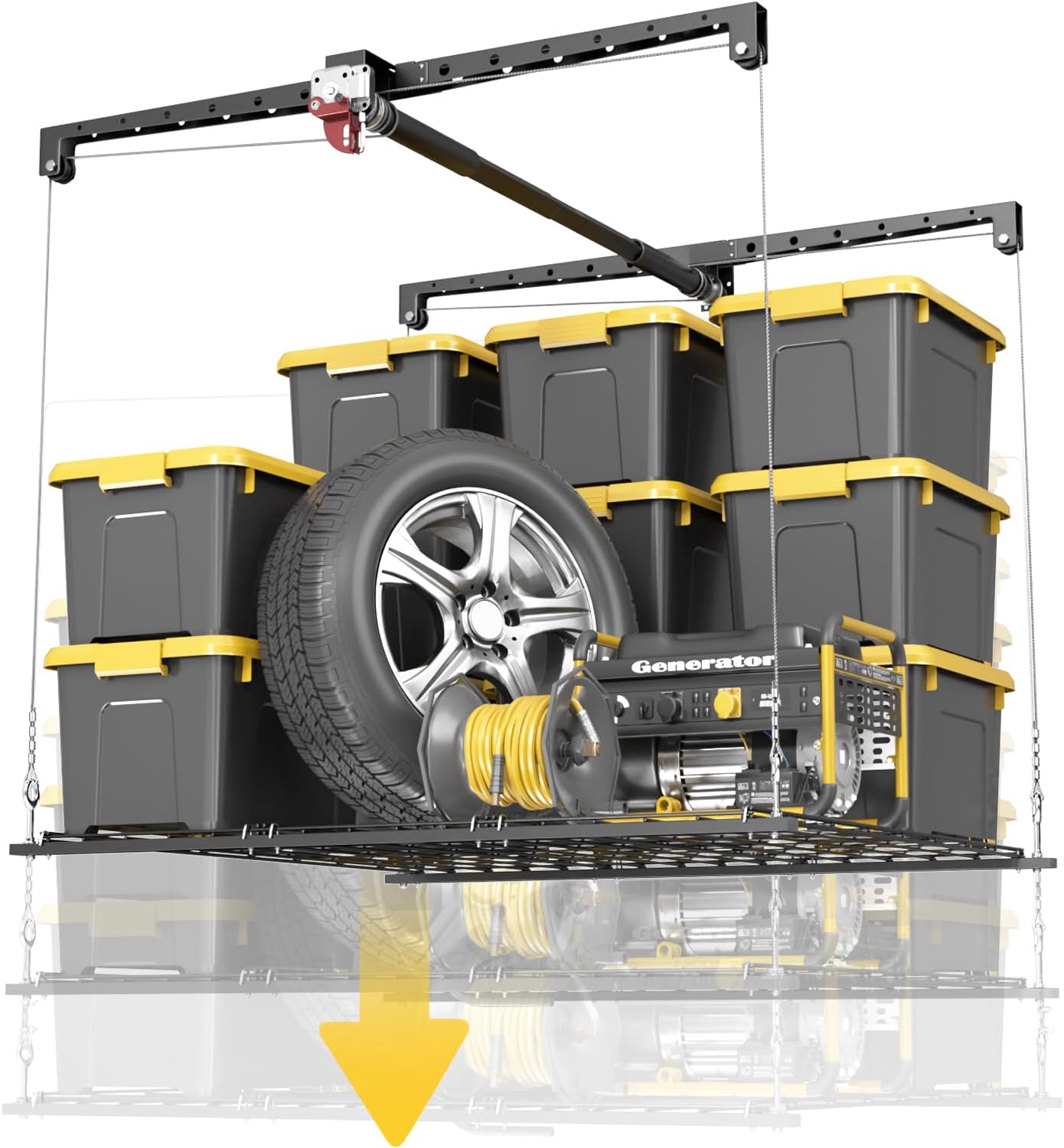 Overhead Garage Storage Rack, 4x4 Ft Adjustable Garage Ceiling Storage Lift, Heavy-Duty Ceiling Mounted Storage Lift System for Garage Organization, 250lbs Weight Capacity