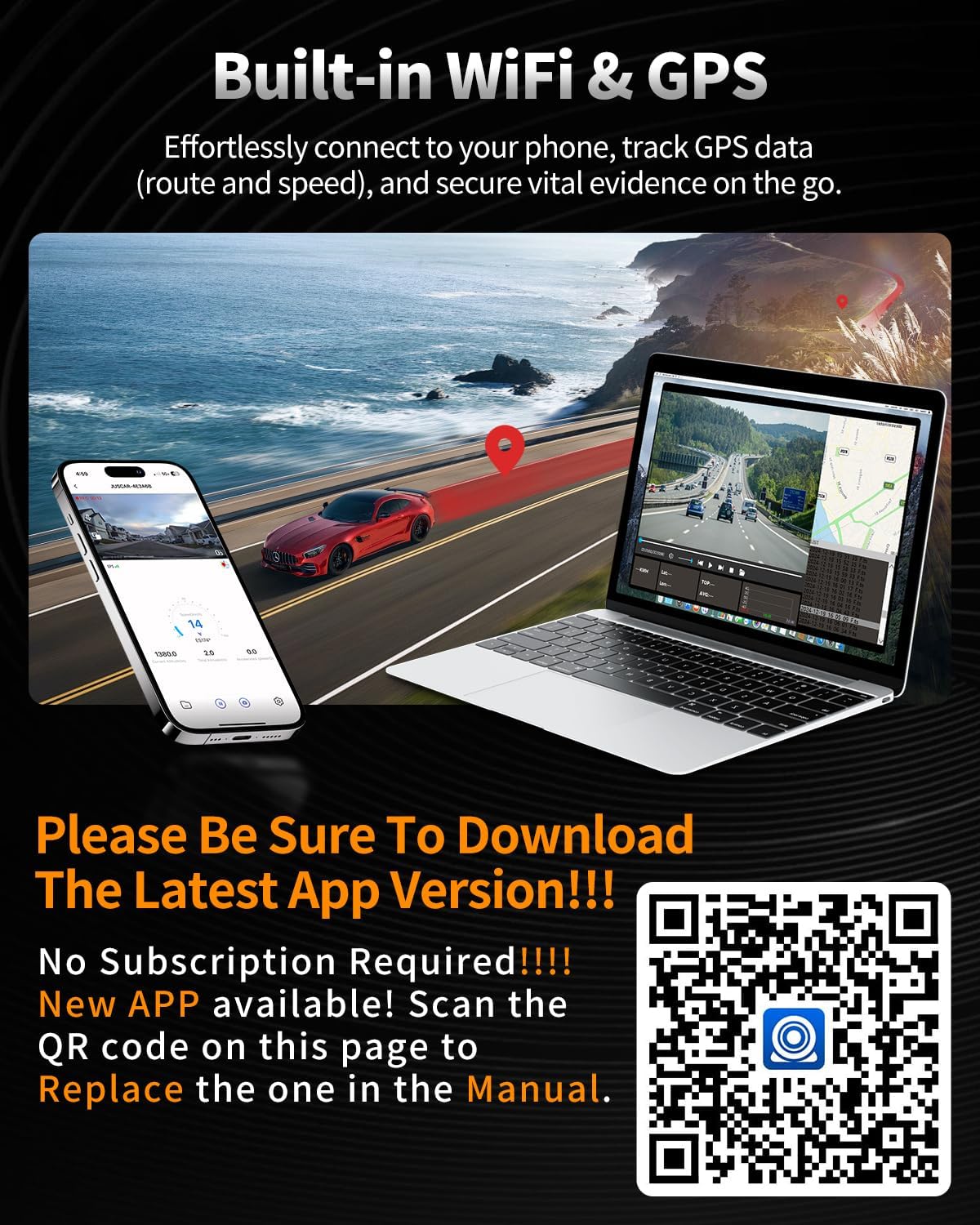 - 【Built-in WiFi & GPS Car Camera】Quickly access key evidence through the App! The G60 dash camera has built-in WiFi for seamless preview, editing, and downloading via the free app. The GPS module tracks your route and speed, saving crucial data like location and speed for accident evidence. View speed and location in real time on the app, and download videos to check your route.