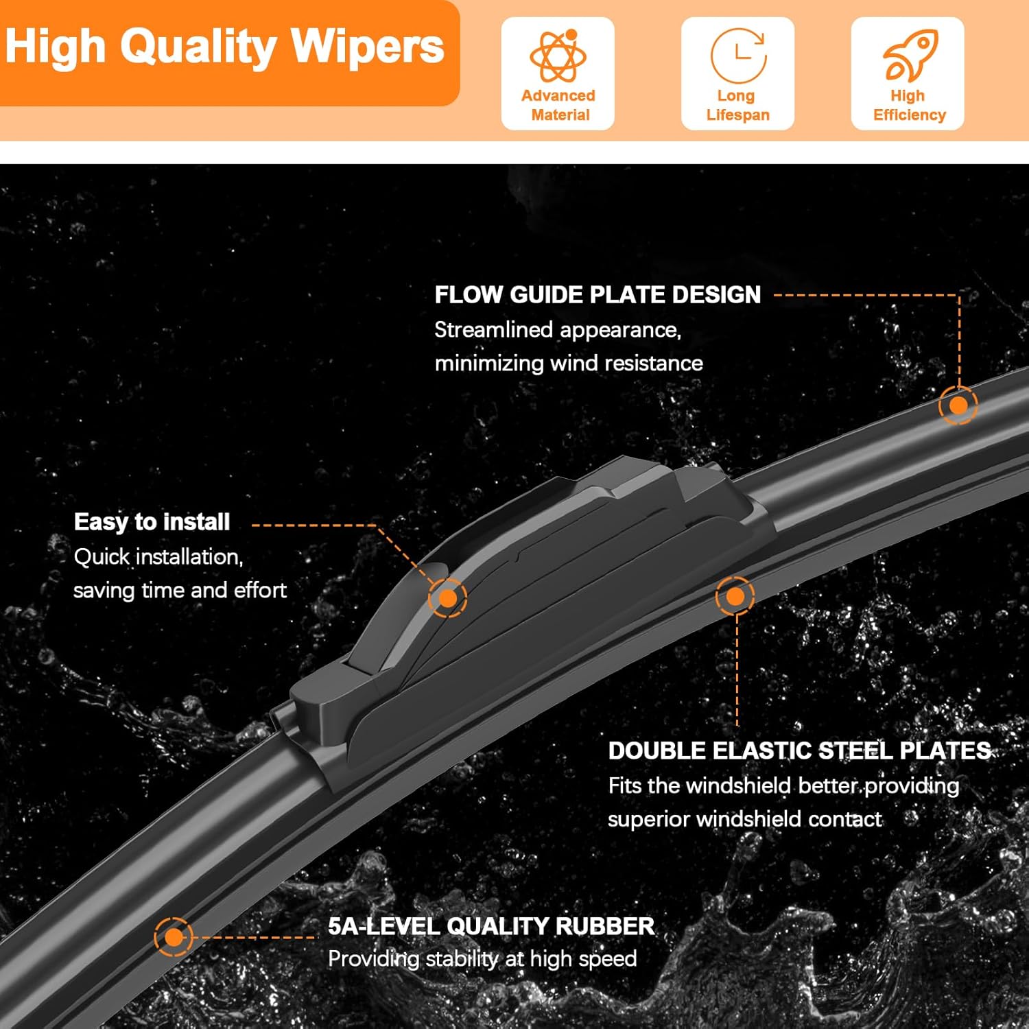 - 𝐔𝐍𝐈𝐐𝐔𝐄 𝐃𝐄𝐒𝐈𝐆𝐍: Built-in flexible asymmetric spoiler distributes uniform downward force along the entire length of the wiper blades, holding it firmly to the windshield at higher speeds to prevent lift-off, ensuring a cleaner wipe when driving