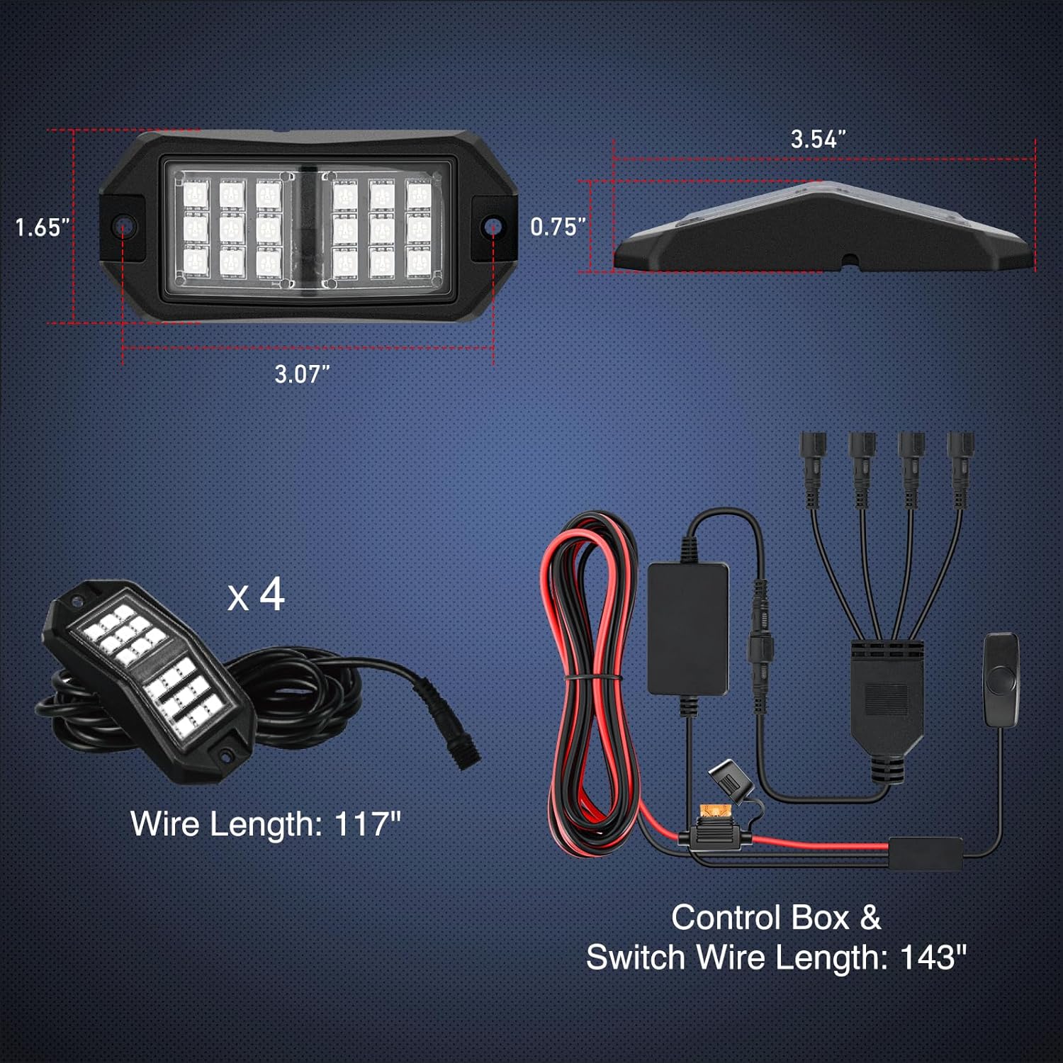 - Quality Materials & Waterproof: Using an aluminum base can effectively and quickly dissipate heat, no longer troubled by heat. Durable and sturdy PC lens is wear-resistant, scratch resistant, and not easily damaged. The combination of PC lens and aluminum base sealing makes the rock light achieve IP67 waterproof, which can also be used in harsh weather conditions