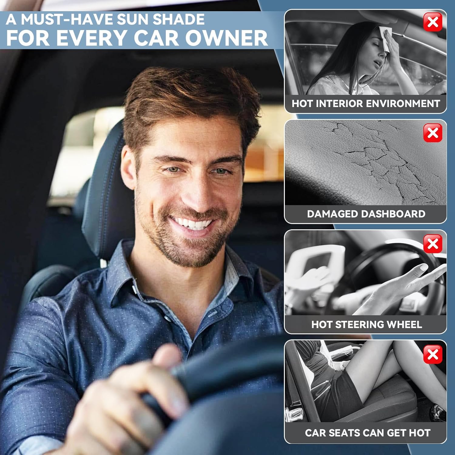 - 【UV Protection】The foldable windshield sun shade is made of high quality polyethylene (HDPE) microfiber,Silver reflective surface can reflect 99% of ultraviolet rays--great sun reflector.blocks heat & sun. Keeps your car cool.