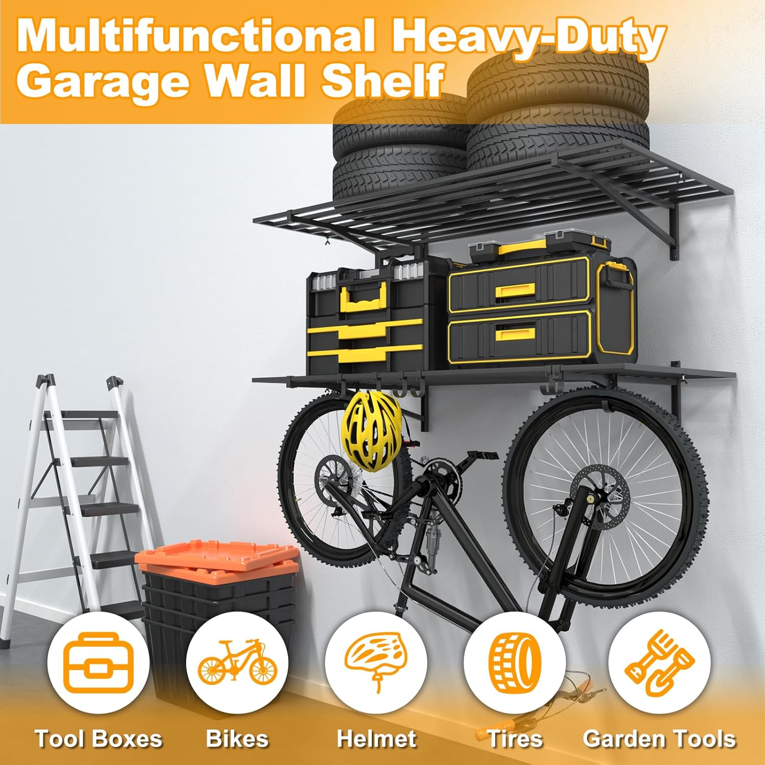 - 【Strong and durable】Garage storage shelves made of heavy-duty steel, the shelves for wall storage and wall brackets are constructed of solid steel square tubing and can hold a total of up to 500 pounds. Solid materials and solid construction ensure that they remain in good condition even when carrying heavy loads for a long time, providing solid and reliable support for your items.