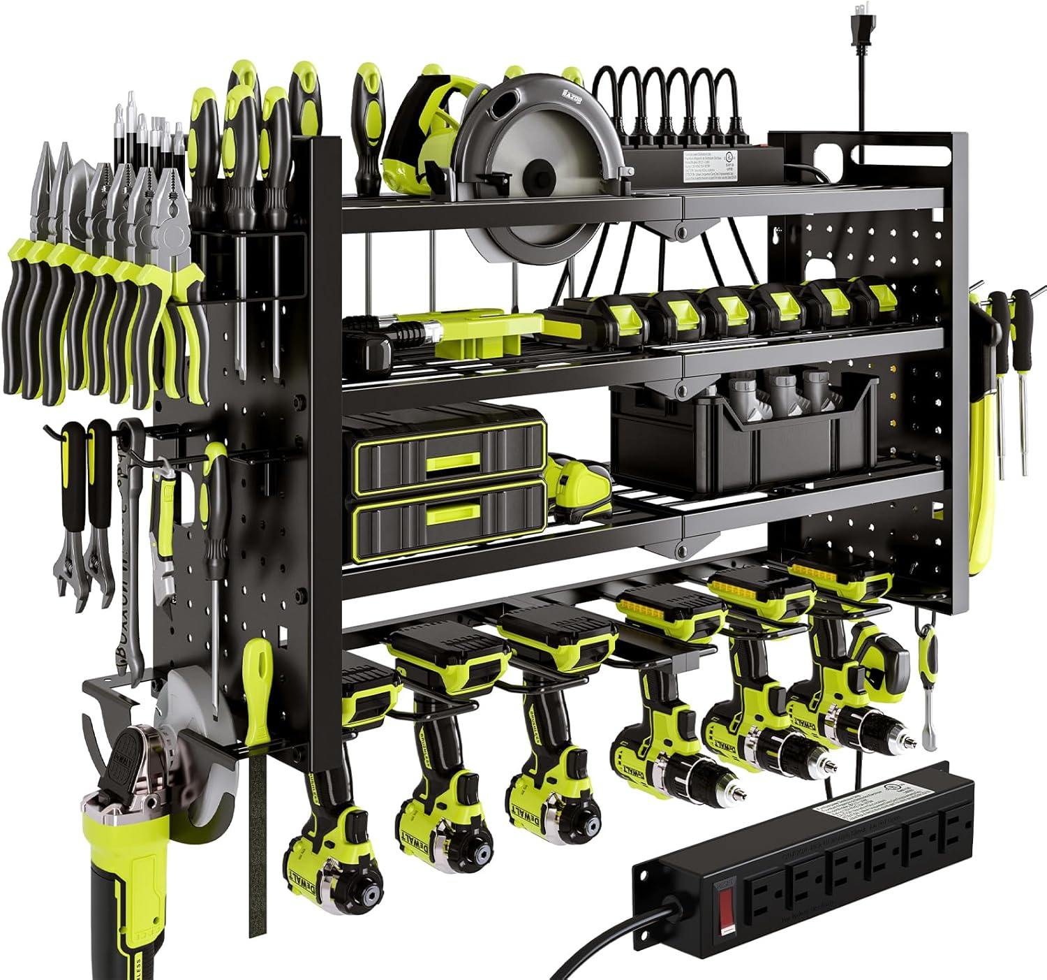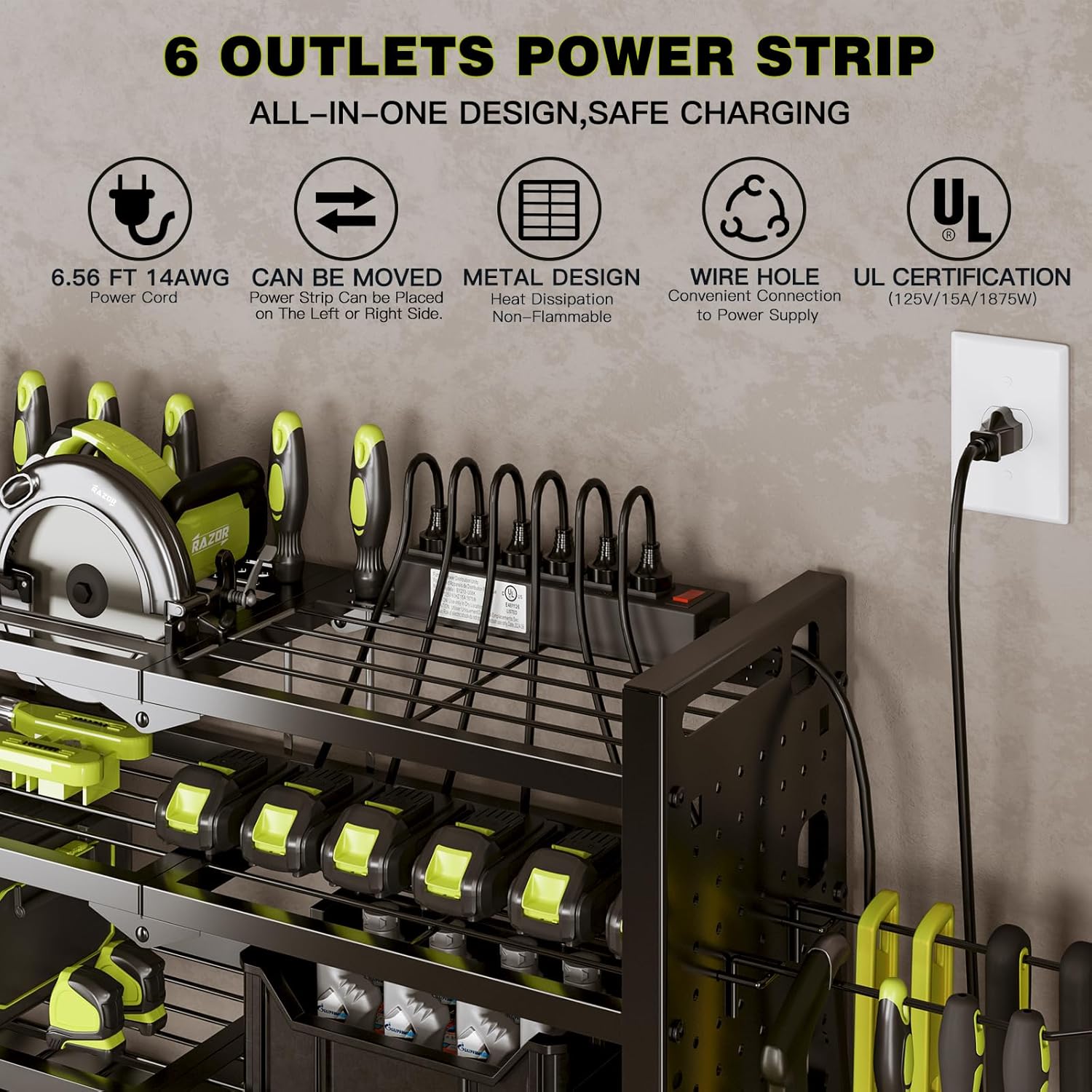 - Smart Charging Solution: Equipped with a UL-certified 6-outlet power strip, provides a safe and efficient charging station for your power tool batteries